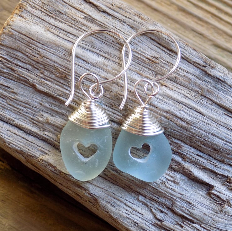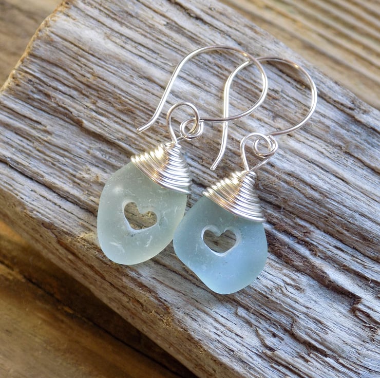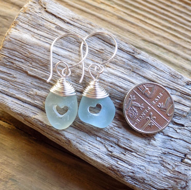 These earrings have been made from small pieces of sea foam coloured sea glass which have had the daintiest of hearts drilled in the centre. Wire wrapped at the top with non-tarnish silver wire and simply hung on my own hand made 0.7 mm sterling silver tumbled ear wires. An unusual and pretty pair of earrings!