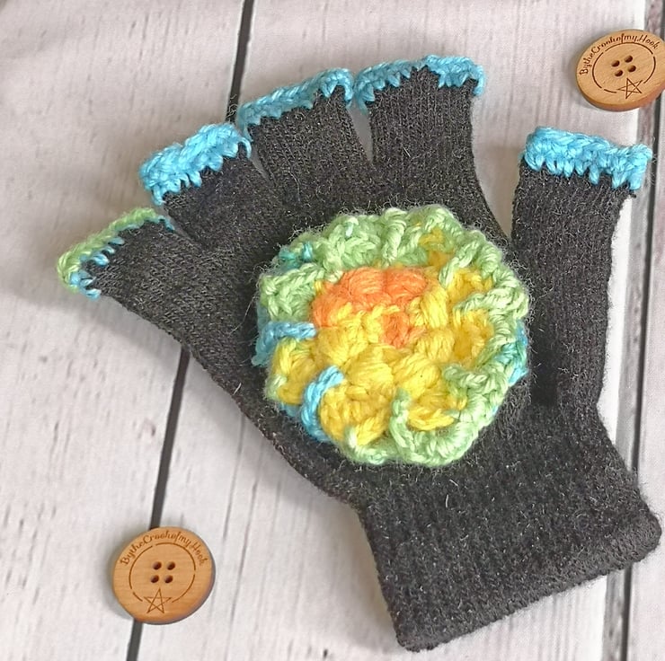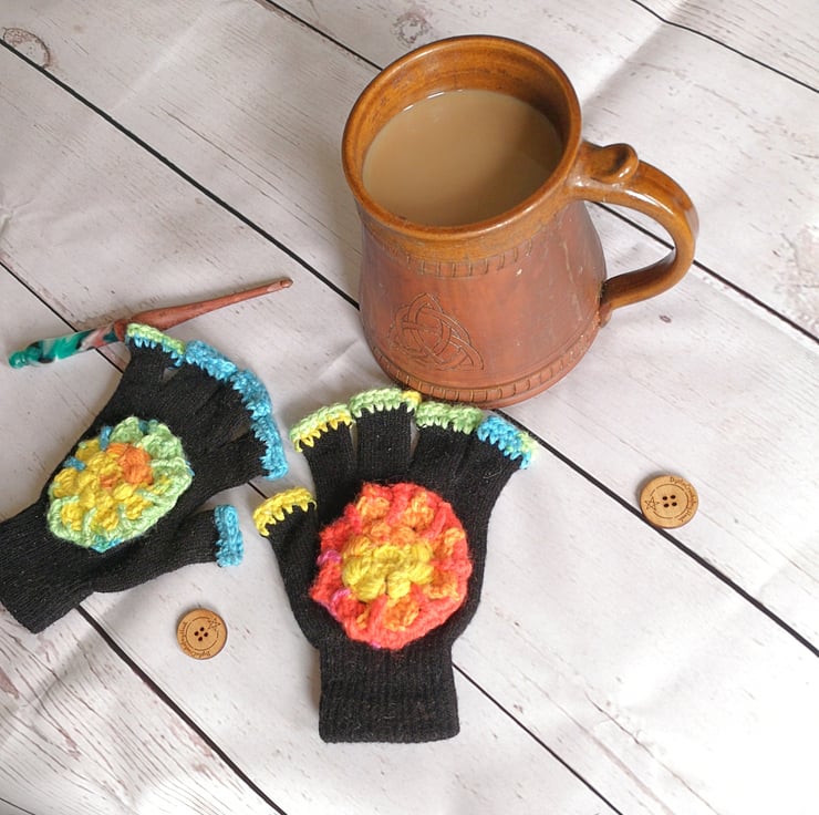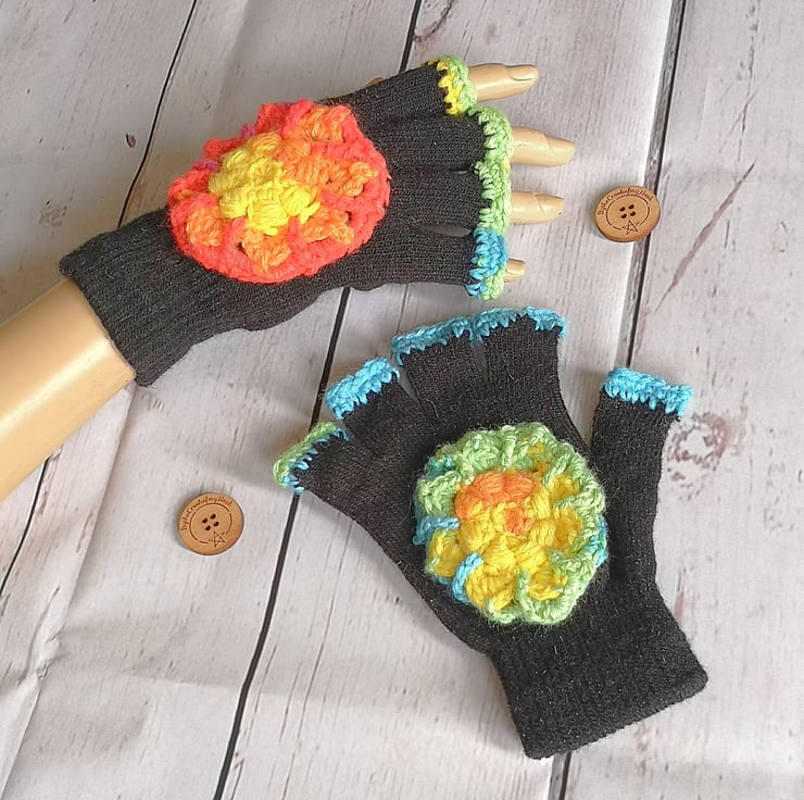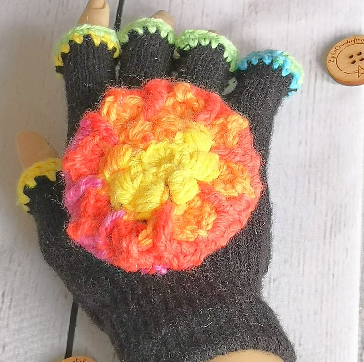 Black one size fits all fingerless gloves enhanced with crochet piping and mandelas in rainbow acrylic yarn.