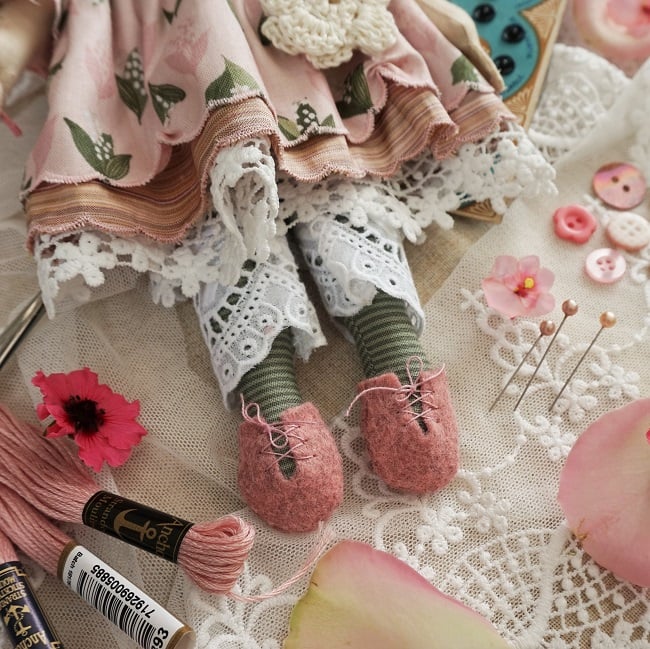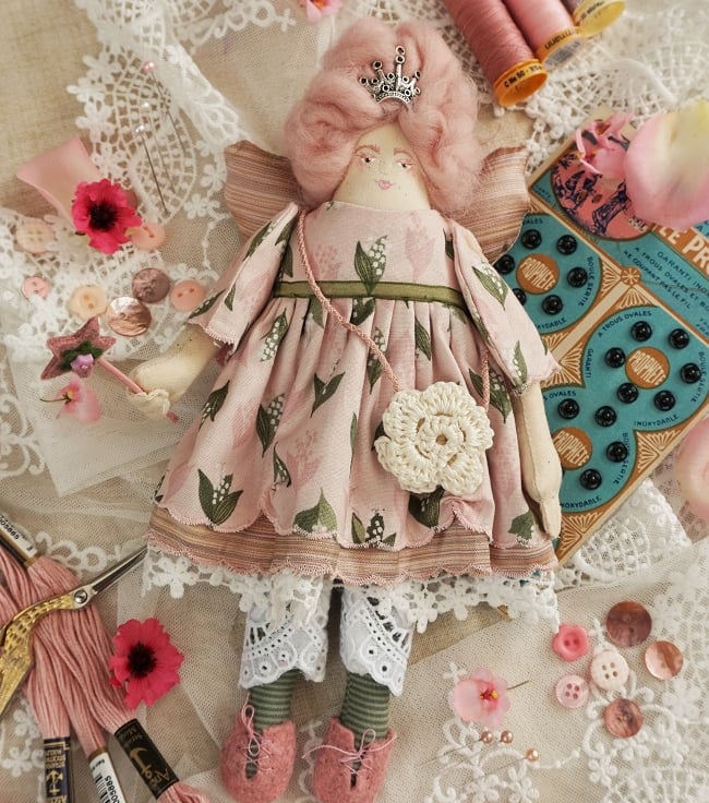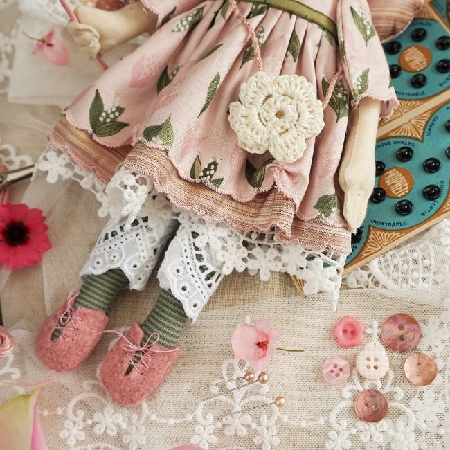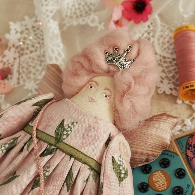 This is Rose. A new smaller pattern, she is about two thirds the size of my witch. This little Fairy God Mother has a ditsy print dress in a warm pink with lily of the valley dotted around, a silk petticoat with lace slip and knickers. She has silk wings and sports a little felt wand. Her shoes are the smallest I have ever made and are felt. She has a rose quartz to her heart with lavender in her stuffing and is finished with tiny buttons, organza ribbon and a little coronet in her hair. Just loved making her xx