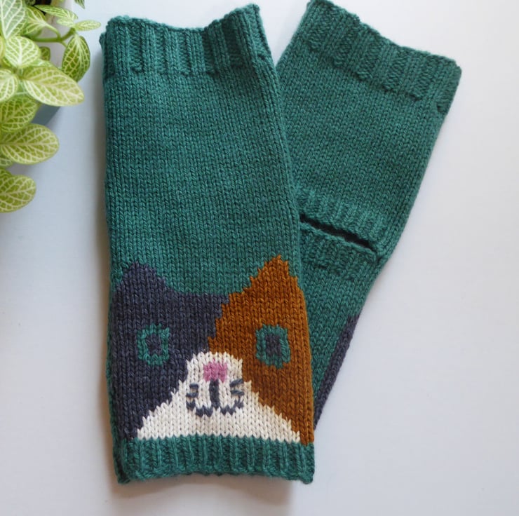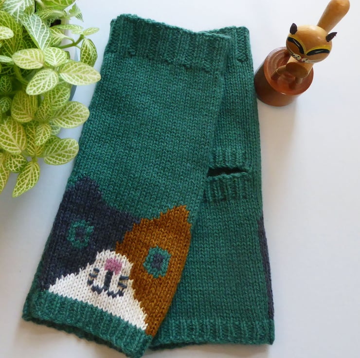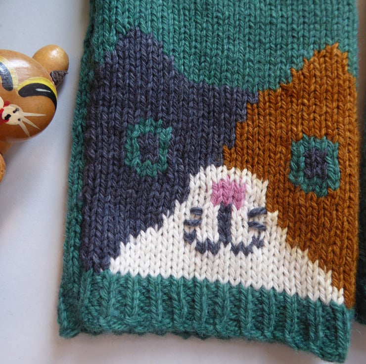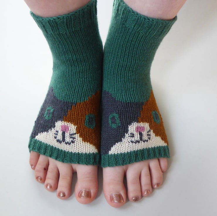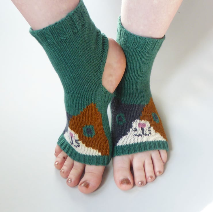 These toeless Cat Yoga socks were made using 4ply merino wool and cotton mix yarn on my vintage knitting machine, using the intarsia method. This allows me to kind of draw with yarn, and have no yarn floats on the inside of the sock, so they feel comfier to wear. These socks have no toes or heel to provide greater grip for when you are exercising, doing yoga poses, Pilates or dance moves. They will l keep your feet warmer when exercising. A fun pair of socks that can be worn with flip flops or sandals on chillier days.