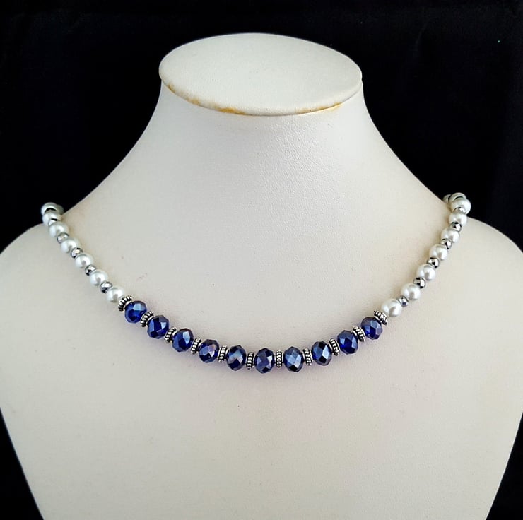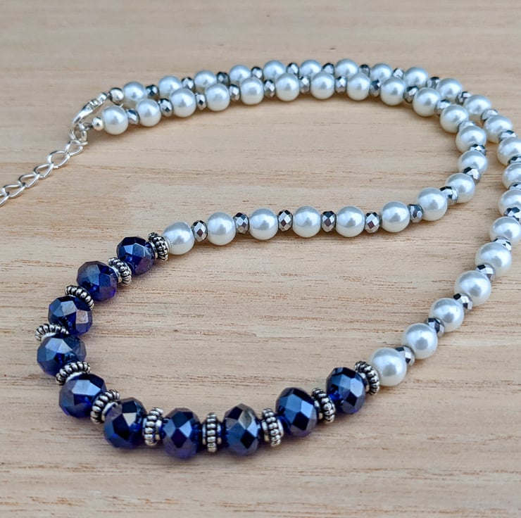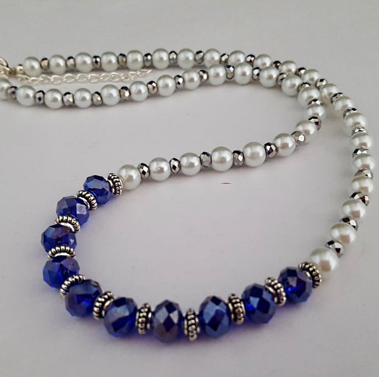 18" necklace of 8mm purple faceted glass beads (AB coated), 6mm white glass pearls and tiny metallic silver faceted glass beads with Tibetan silver spacers. With silver plated lobster clasp fastening and 2" extension chain. In an organza gift bag.