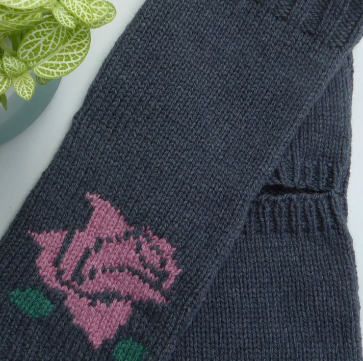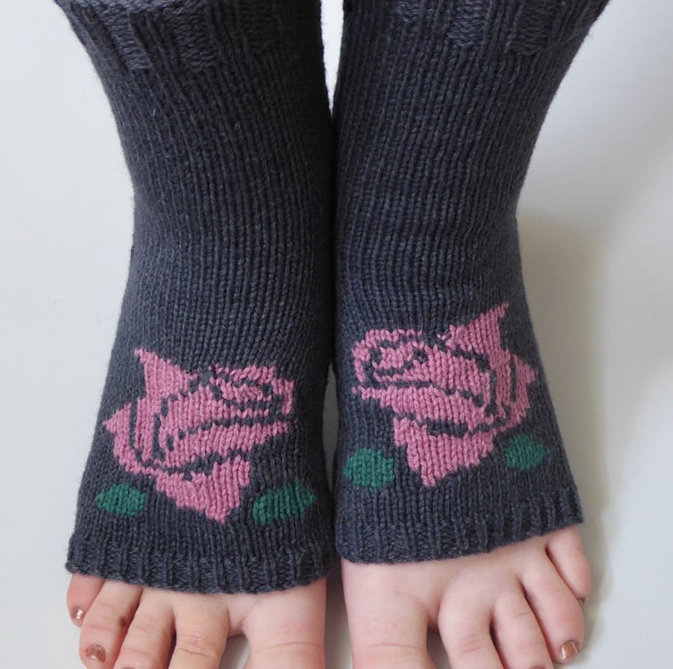 These Rose Yoga socks have been machine knitted with 4ply organic merino wool and organic cotton mix yarn on my vintage machine using the intarsia method, so there are no floats on the inside of the sock to snag, making them comfier to wear. They have an open heel and toe, providing extra grip during yoga, Dance, Pilates moves. They will keep your feet warmer while exercising.