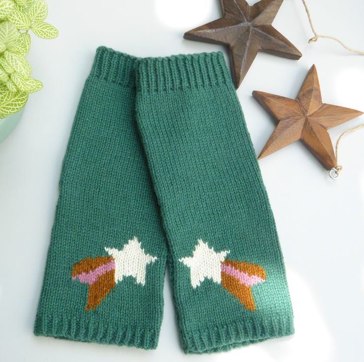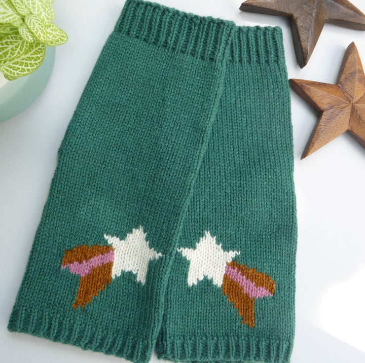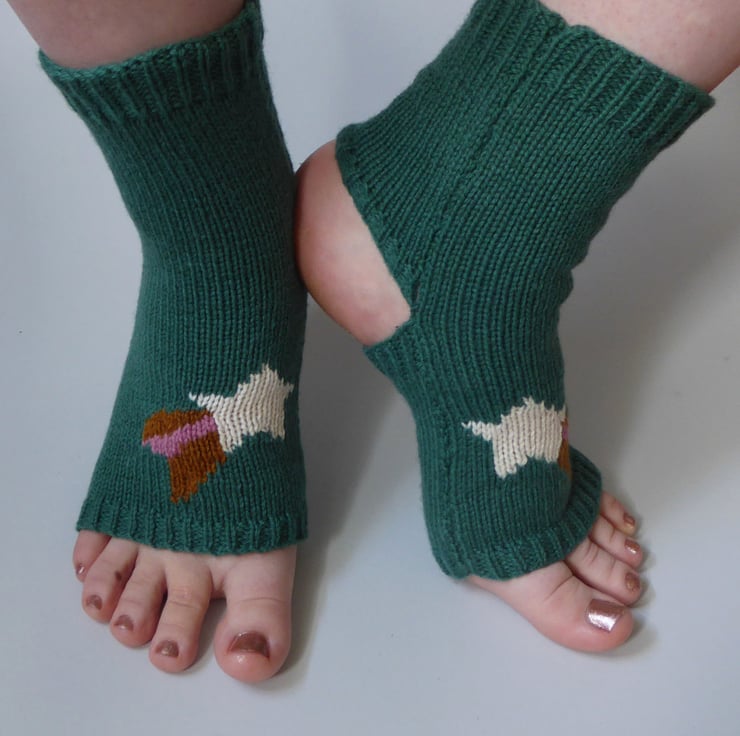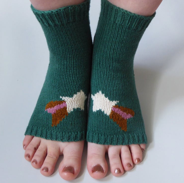 Toeless Merino wool Yoga socks in green with a shooting star design. They could also be worn for Pilates or Dance classes. These fun socks have an open heel and toe providing extra grip during yoga poses, dance moves, Pilates or other exercises. Can be worn with sandals or flip flops to keep your feet cosy. Great for when you want to keep feet warm during pedicures.