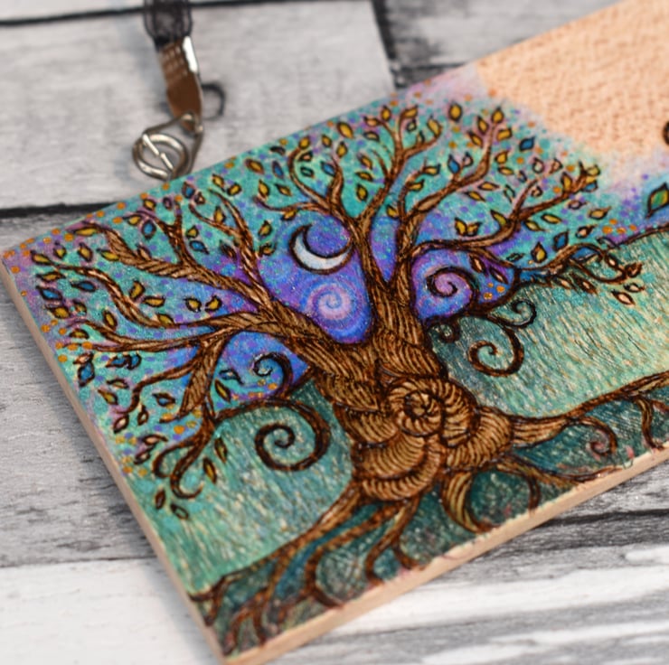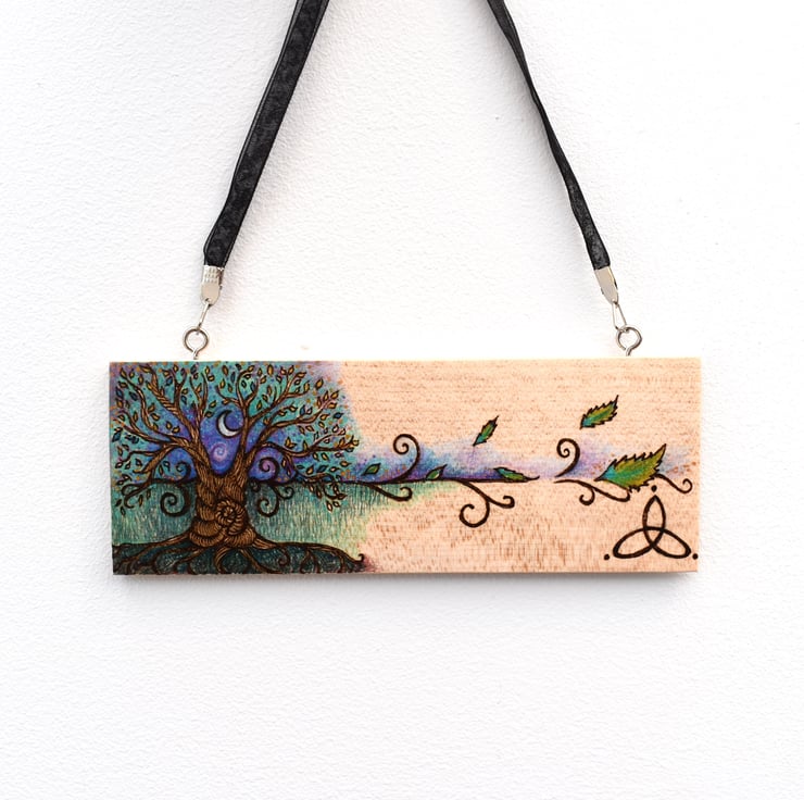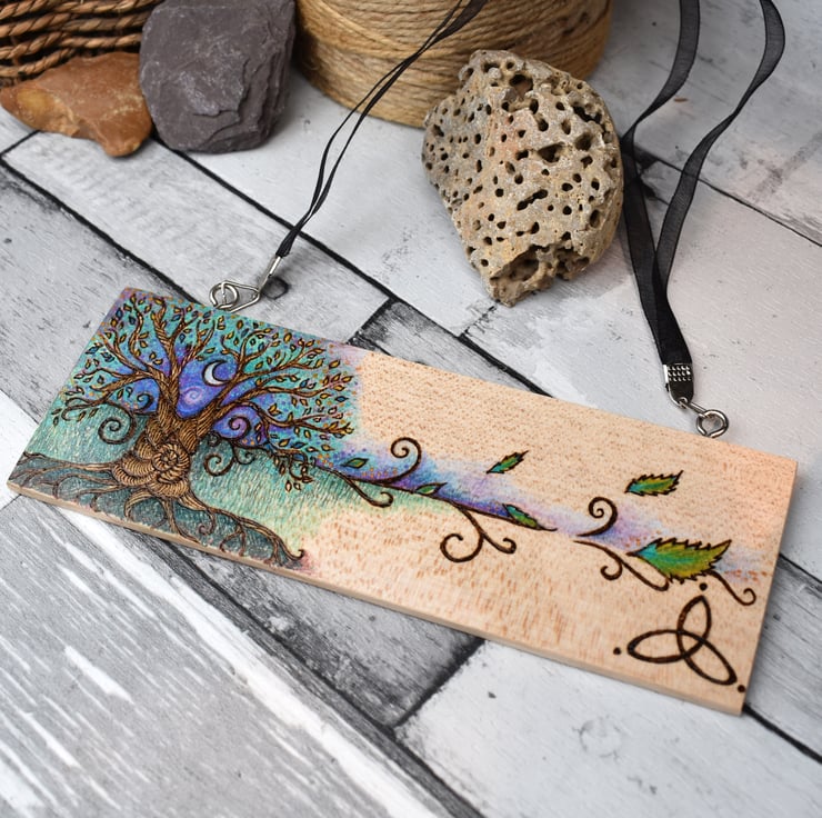 Hand burned lightweight twisted tree hanging plaque. Decorated using pyrography and then coloured using Caran d'ache pencils.