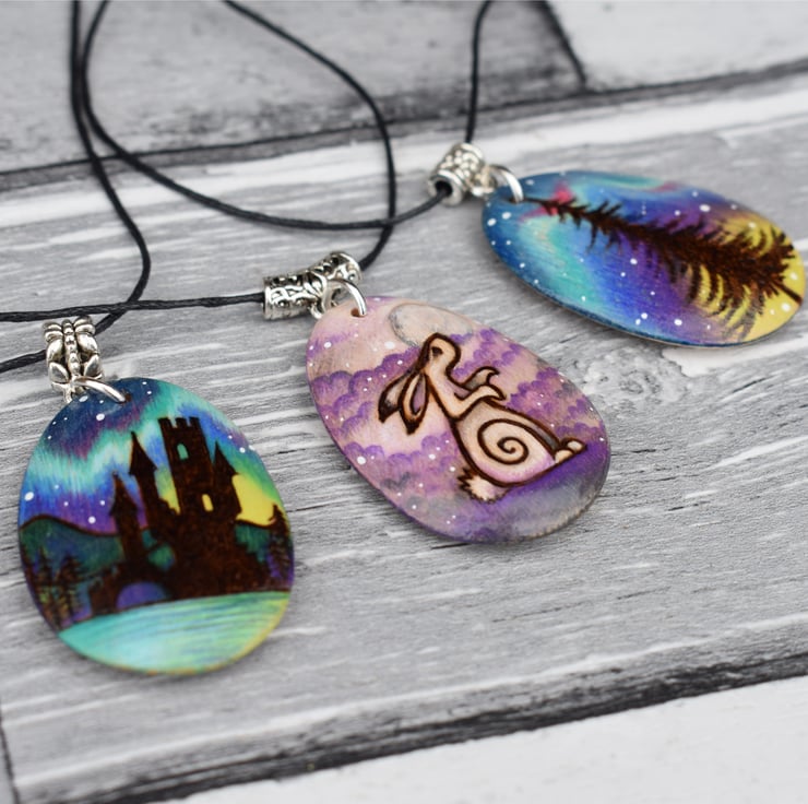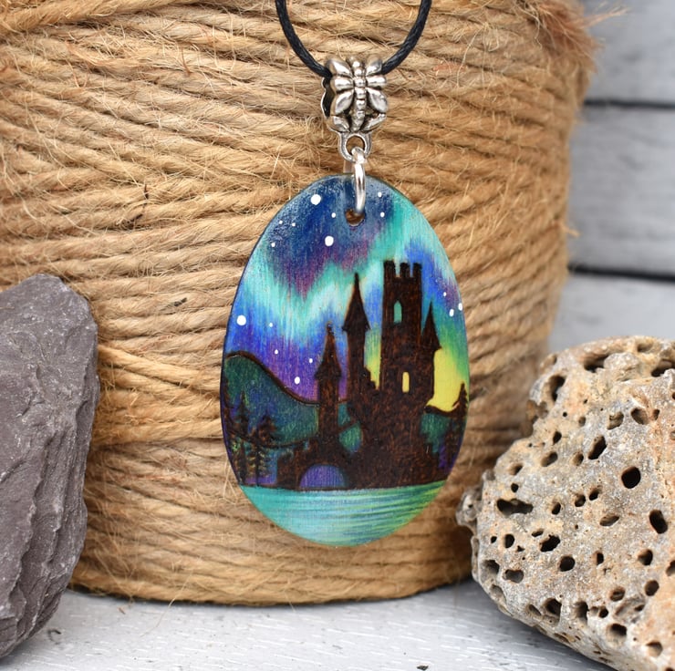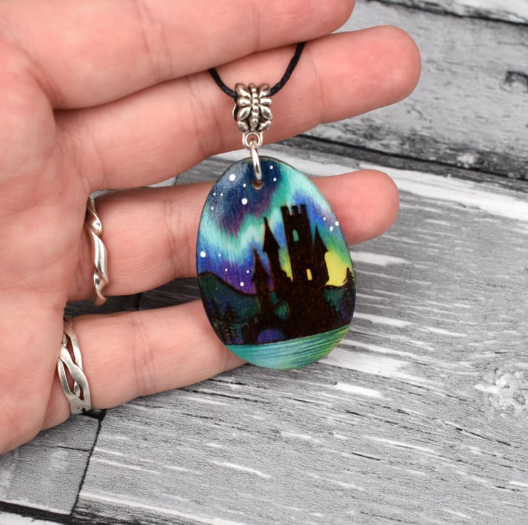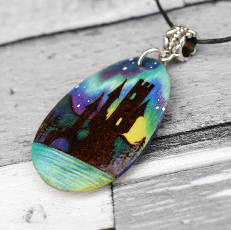 A mysterious aurora scene adorns this teardrop pendant, with a lonely castle silhouette. Hand burned using pyrography or wood burning. Coloured with art pencils. Ideal for a northern lights fan or a five year wood anniversary gift.