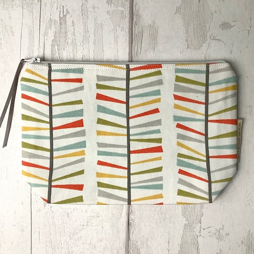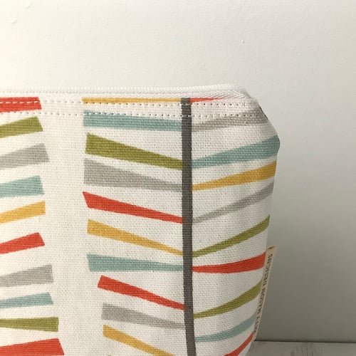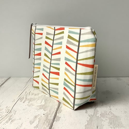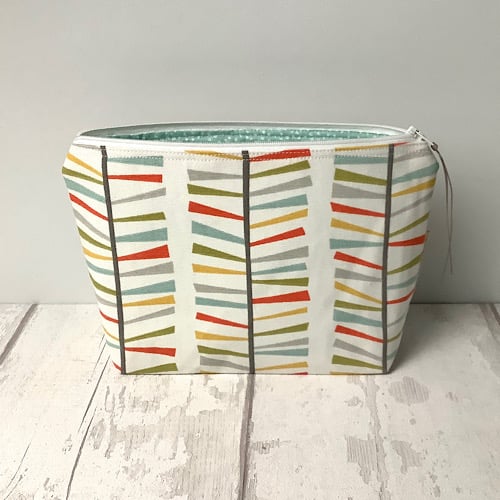 Pretty make-up or useful things bag in a multi-coloured geometric fabric. Fully lined in coordinating blue spot fabric. 17.5cm wide at bottom, 24cm wide at top, 15.5cm high, 7cm deep at base. Please note, there might be a slight difference to the pictures shown due to the pattern repeat of the fabric.