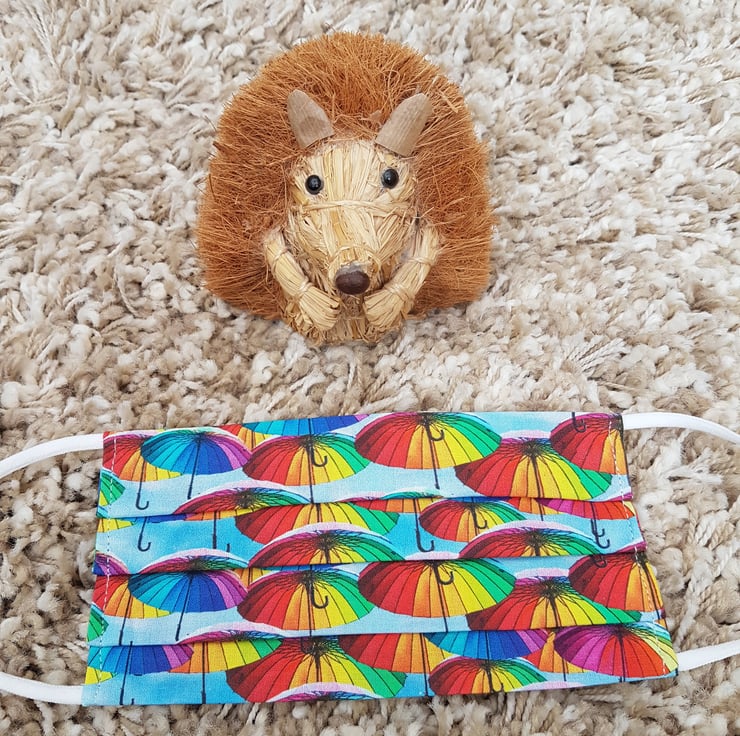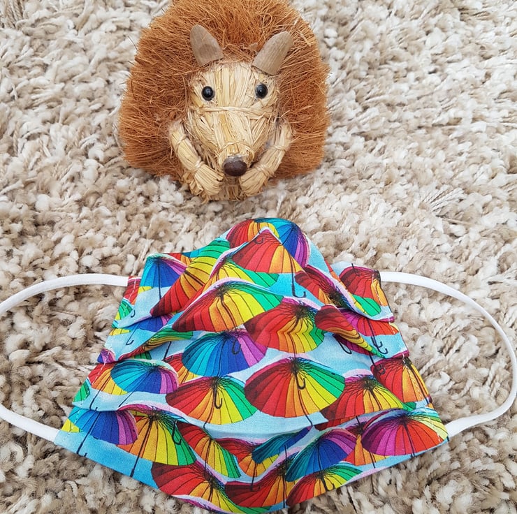 Small Adult/Teenager face covering made from a rainbow umbrella print on blue cotton. The face mask is made with 2 layers of cotton forming an inner pocket for a filter (not included) and is fastened over the ears with 2 loops of elastic and a toggle adjuster.