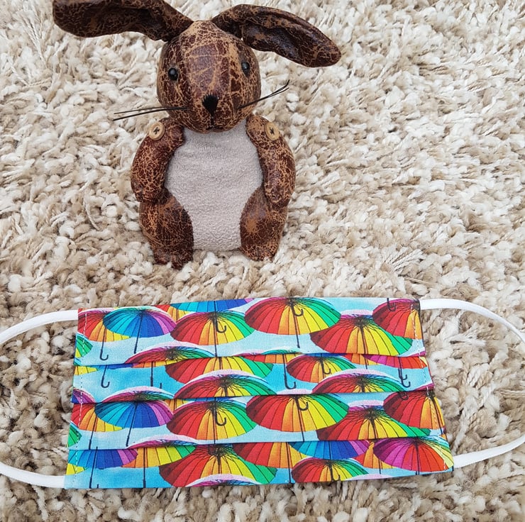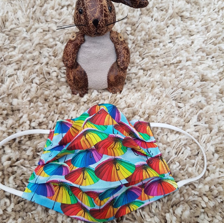 Adult face covering made from a rainbow umbrella print on blue cotton. The face mask is made with 2 layers of cotton forming an inner pocket for a filter (not included) and is fastened over the ears with 2 loops of elastic and a toggle adjuster.