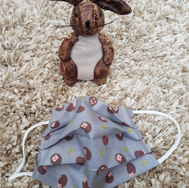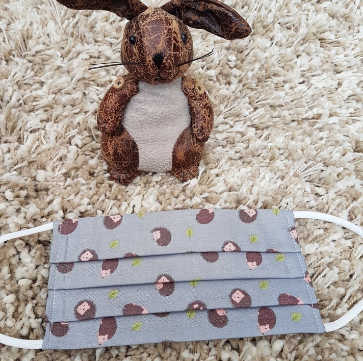 Adult face covering made from a hedgehog and leaf print on grey cotton. The face mask is made with 2 layers of cotton forming an inner pocket for a filter (not included) and is fastened over the ears with 2 loops of elastic and a toggle adjuster.