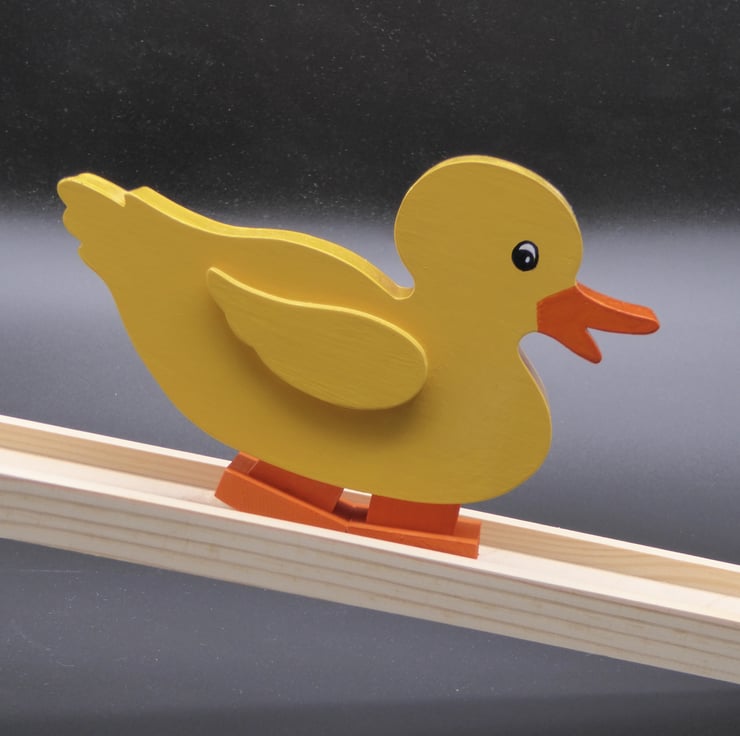 Hand crafted wooden duck which waddles down his ramp in a fascinating way. making an enticing "quacking" noise as he goes. A guaranteed favourite with both children and parents.