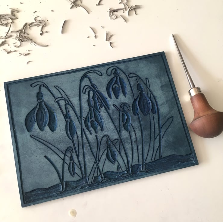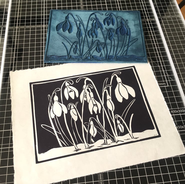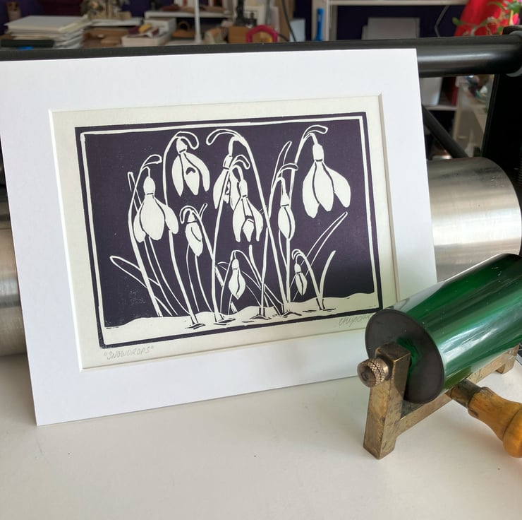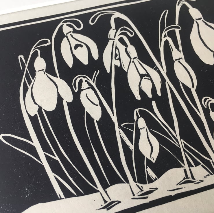 My large "Snowdrops" print is created using the relief printmaking method of linocut printing. As each print is created by hand there may be tiny variations which add to the individual beauty of each original artwork. "Snowdrops" is printed onto Okawara 51gsm printmaking paper from the Awagami factory in Japan.