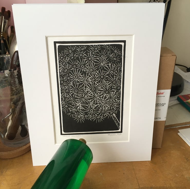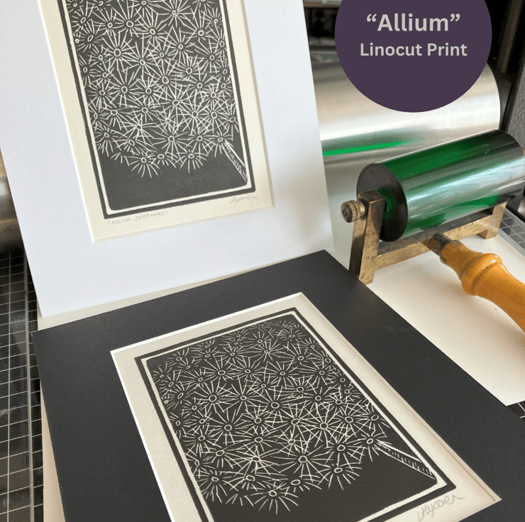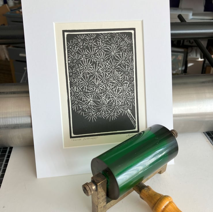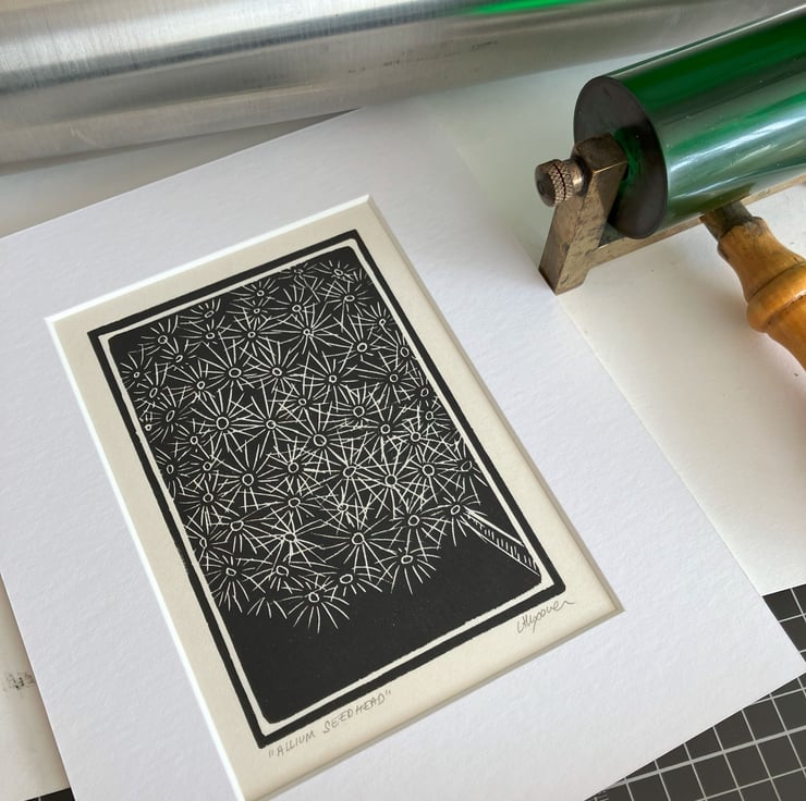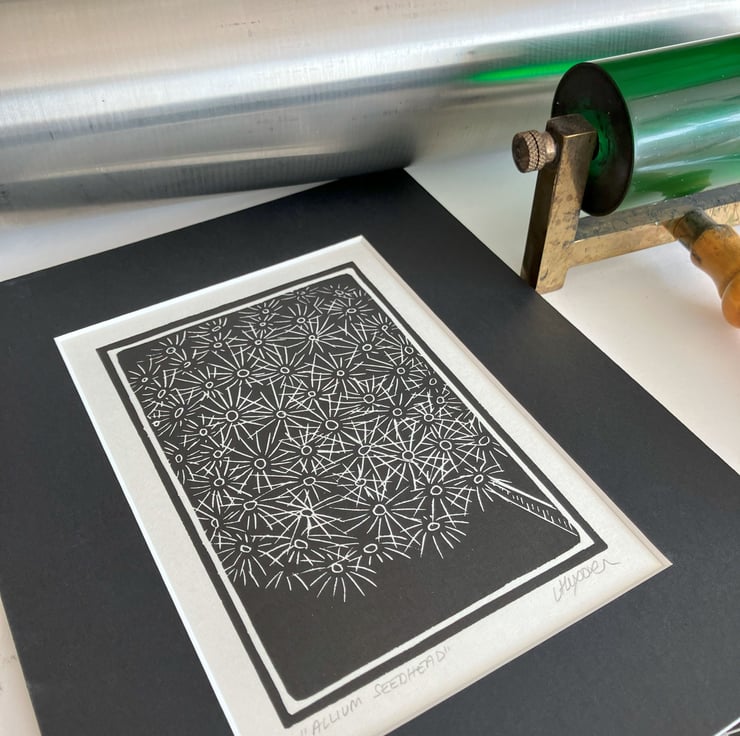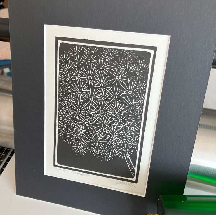 "Allium Seedhead" is created using the relief printmaking method of linocut printing. As each print is created by hand there may be tiny variations which add to the individual beauty of each original artwork. "Allium Seedhead" is printed onto Japanese printmaking paper