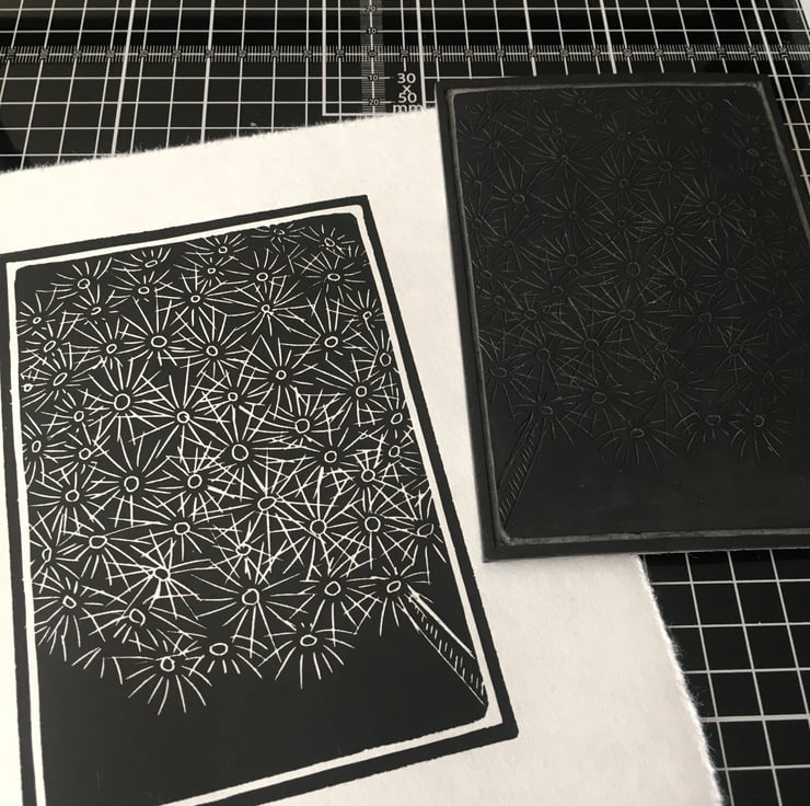 Linocut is a relief printmaking process where an image is transferred or drawn directly in reverse onto the lino block. It is then carved using mainly U and V shaped gouges into the surface of the lino. Ink is then applied to the block and paper laid onto the inked surface. The paper is then hand burnished or pressed and the print lifted from the block.