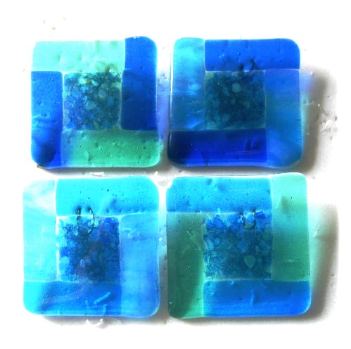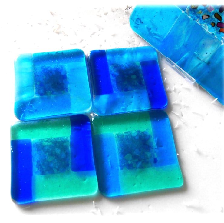 I've used 4 different shades and types of turquoise coloured glass for the borders,2 colours per coaster, so they are all individual but colour coordinated so they make a set.