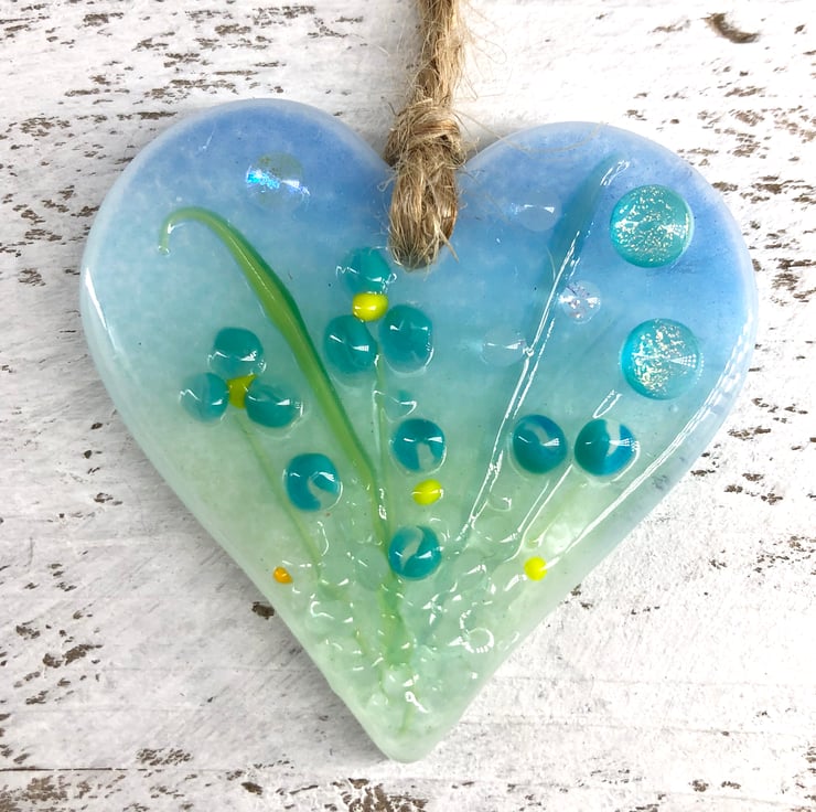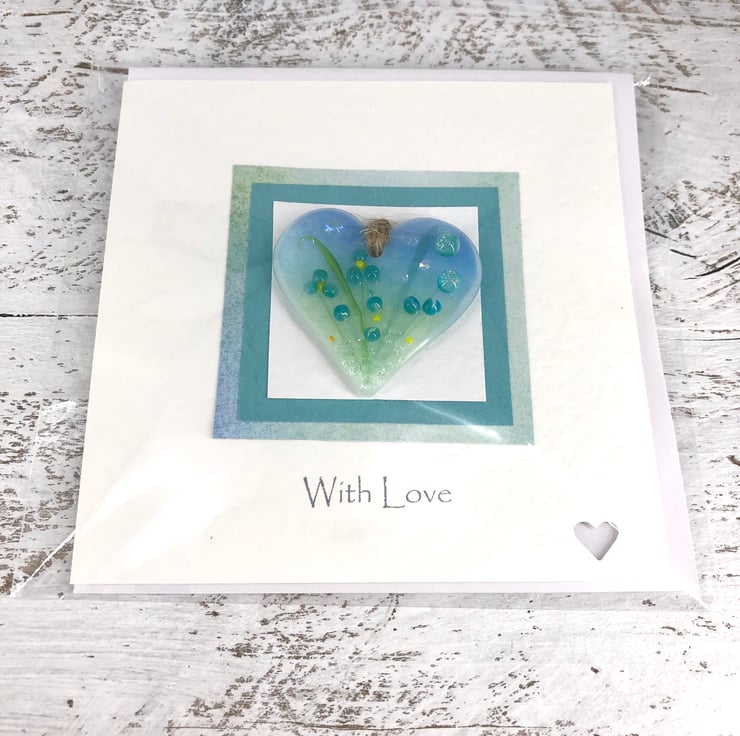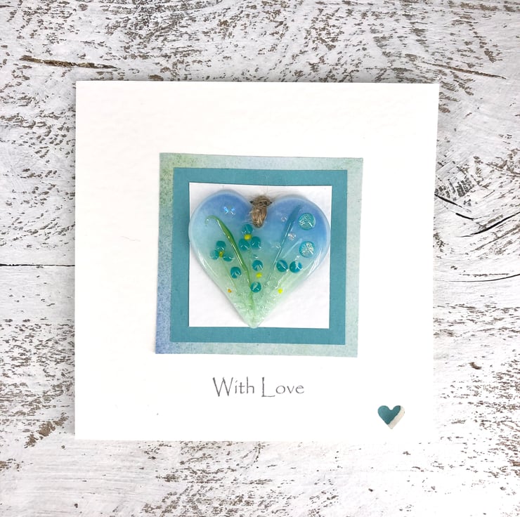 A lovely handmade card with a gorgeous fused glass heart with turquoise meadow flowers attached to it - the perfect card and gift in one!
