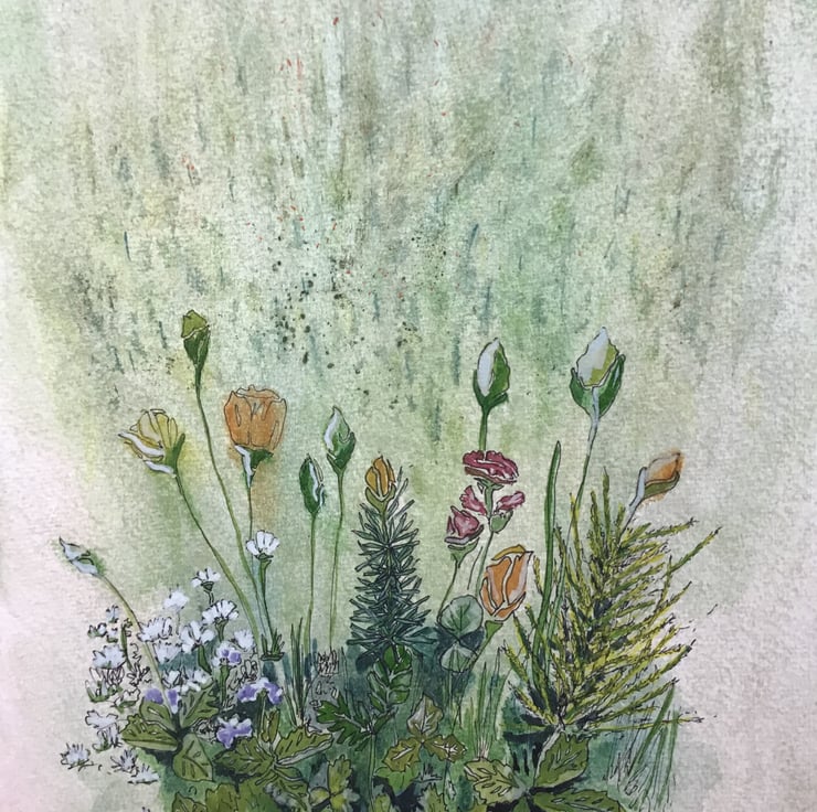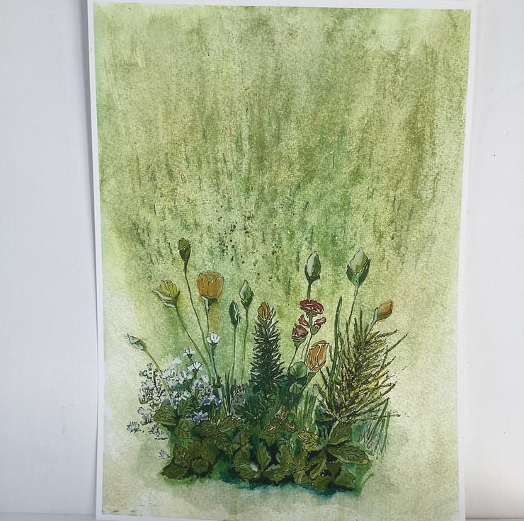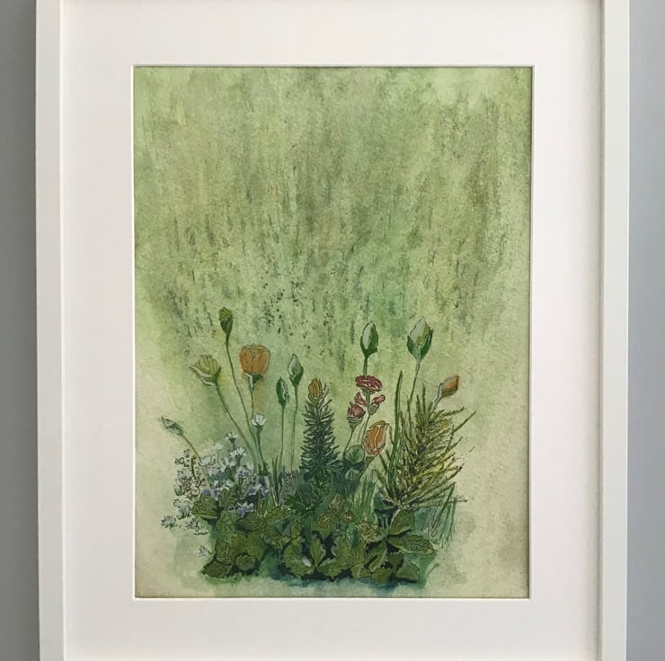 Beautiful print, printed on archive cotton paper, from original watercolour, embellished with gold flecks, inspired by flowers swaying in the breeze of a summer garden. 297mm x 420mm (A3), unmounted Sold without mount and frame.