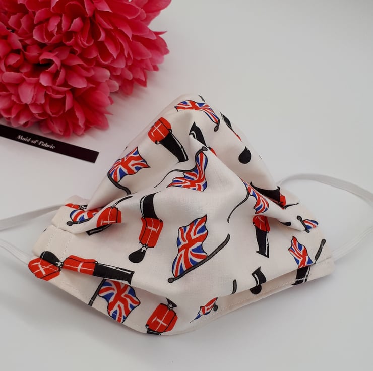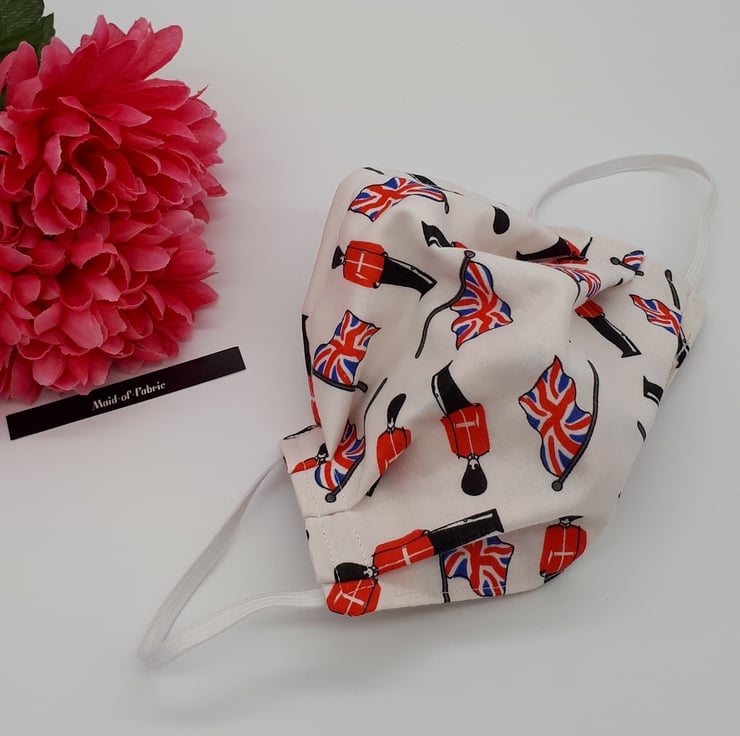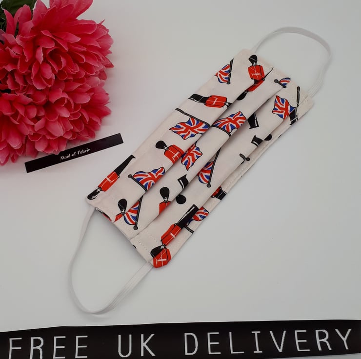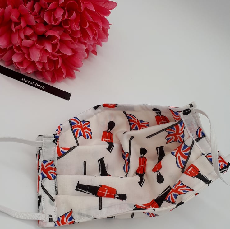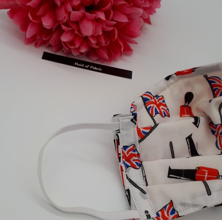 Face mask made using this fun white Queens guard print fabric, white elastic and a 9cm flat nose wire.