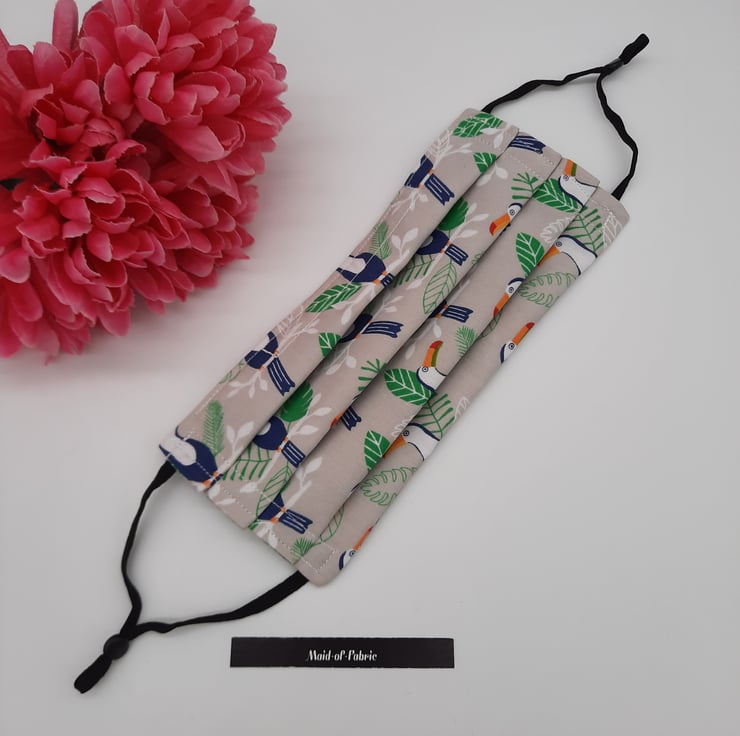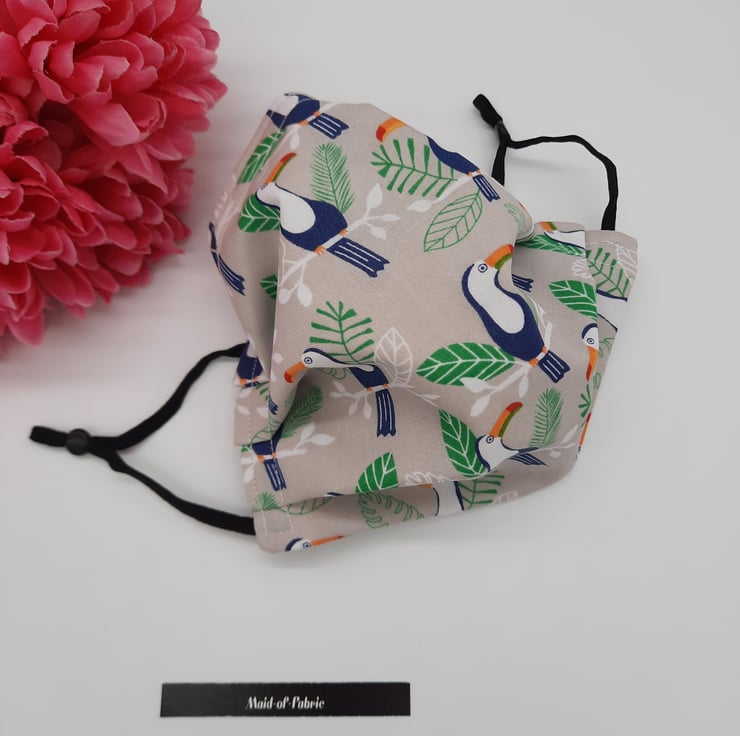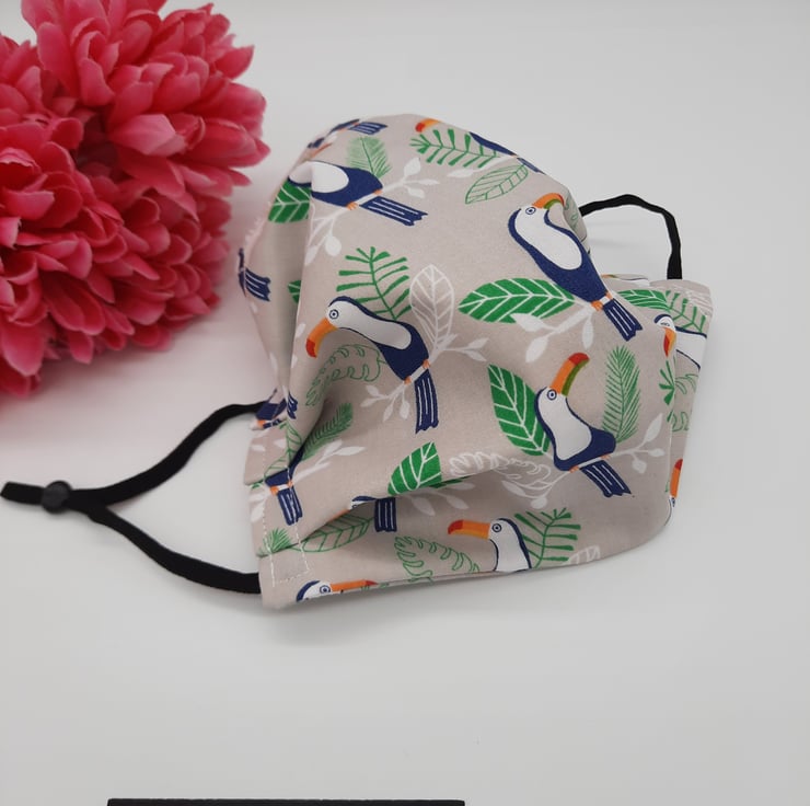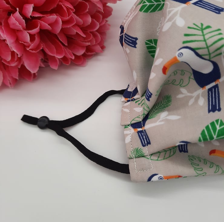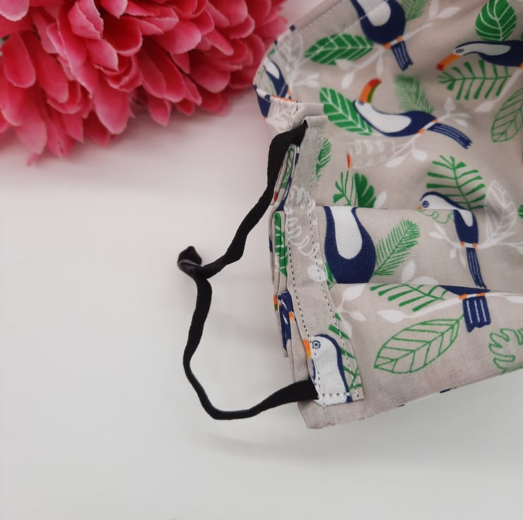 Face mask made using a grey and blue toucan patterned cotton fabric. Black adjustable elastic and a 9cm flat bendable nose wire.