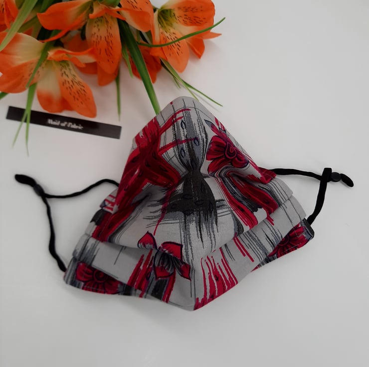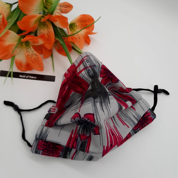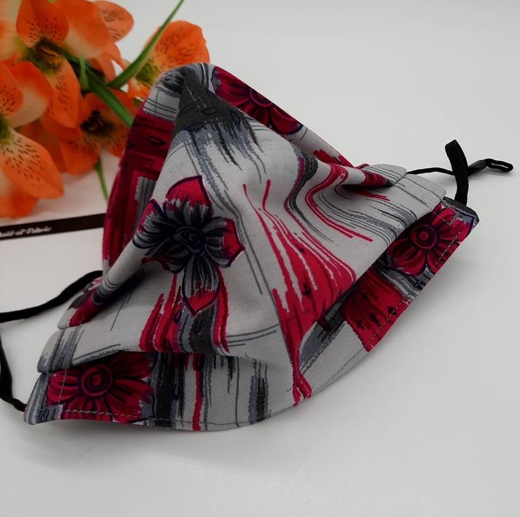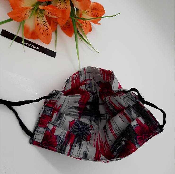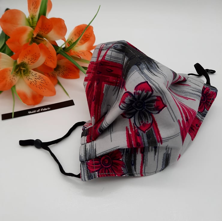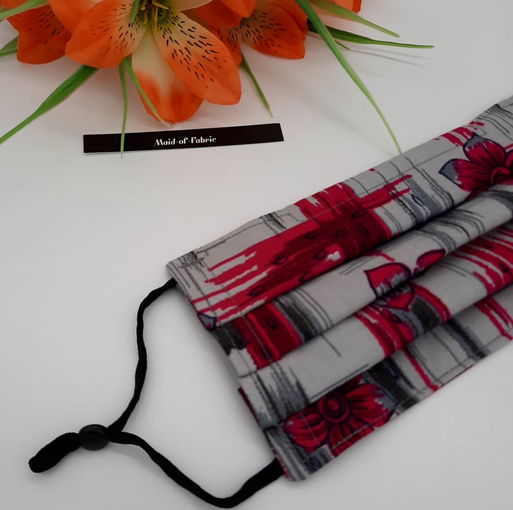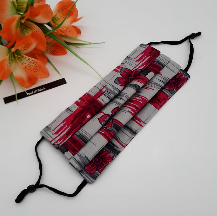 Face mask made using a pink and grey patterned cotton fabric, adjustable soft black elastic and a 9cm flat bendable nose wire.
