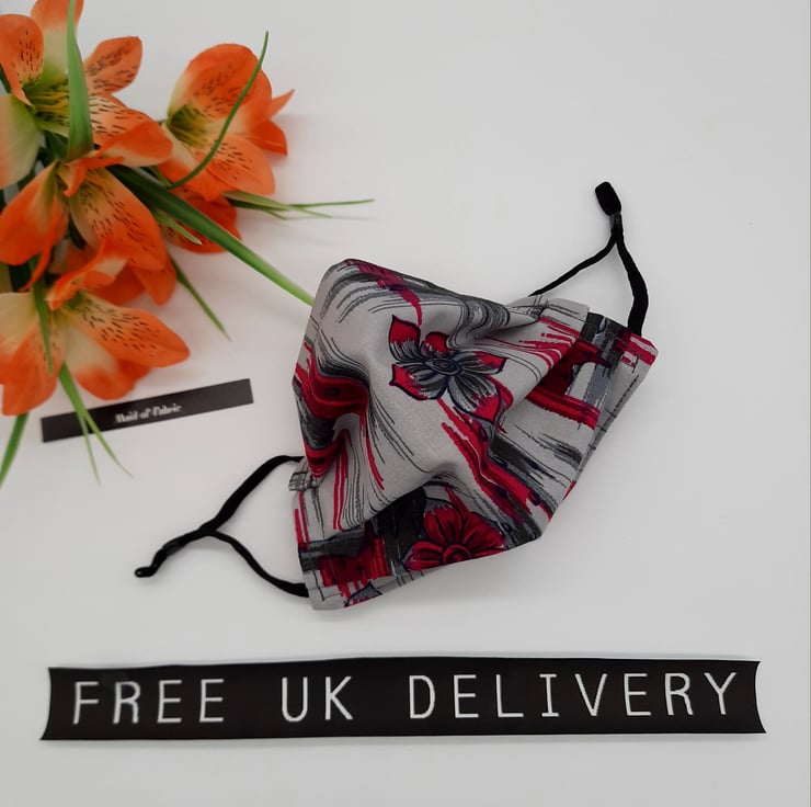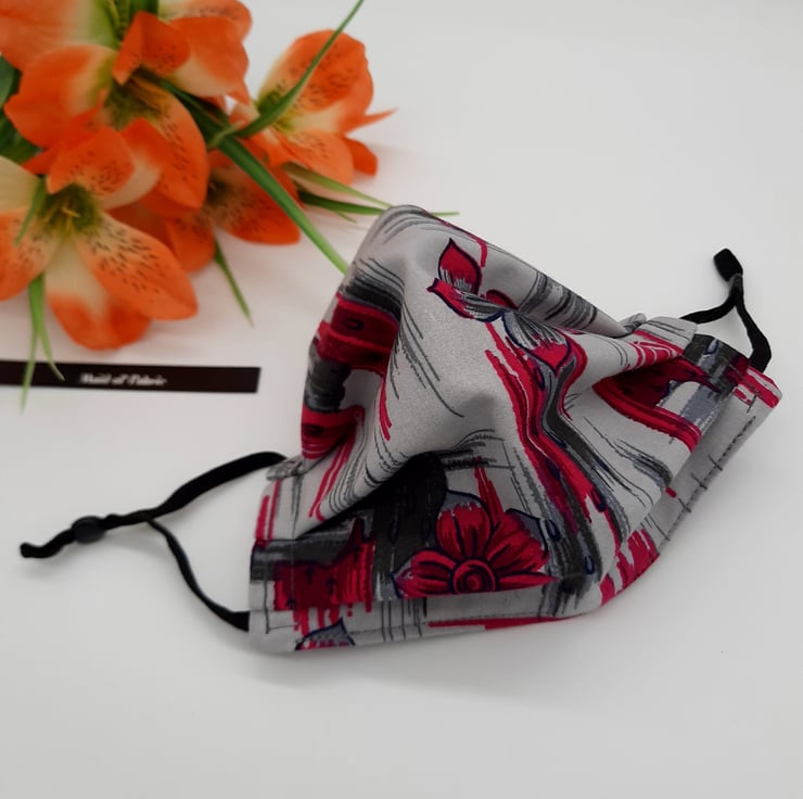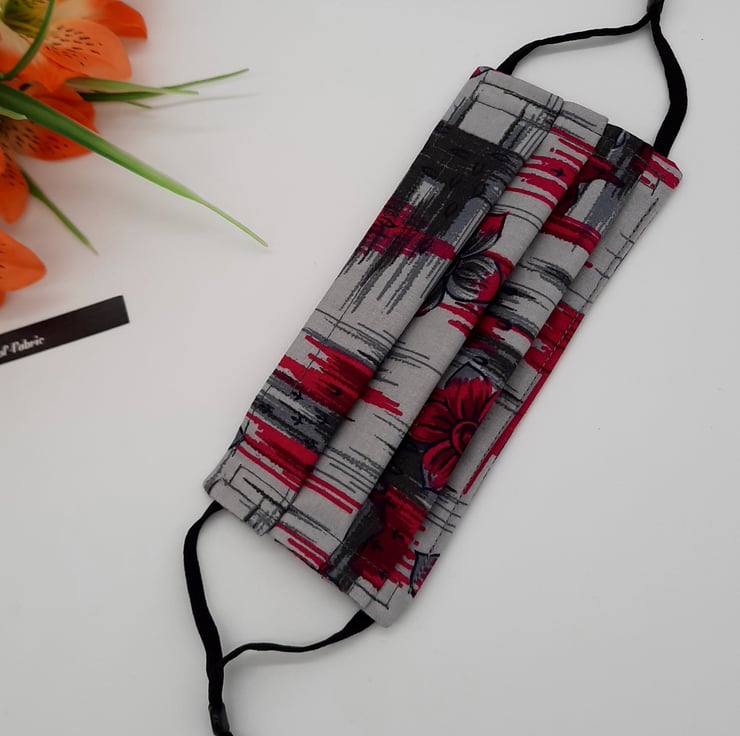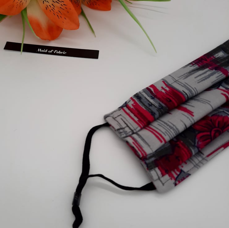Face mask made using a pink and grey patterned cotton fabric, black adjustable elastic and a 9cm flat bendable nose wire.