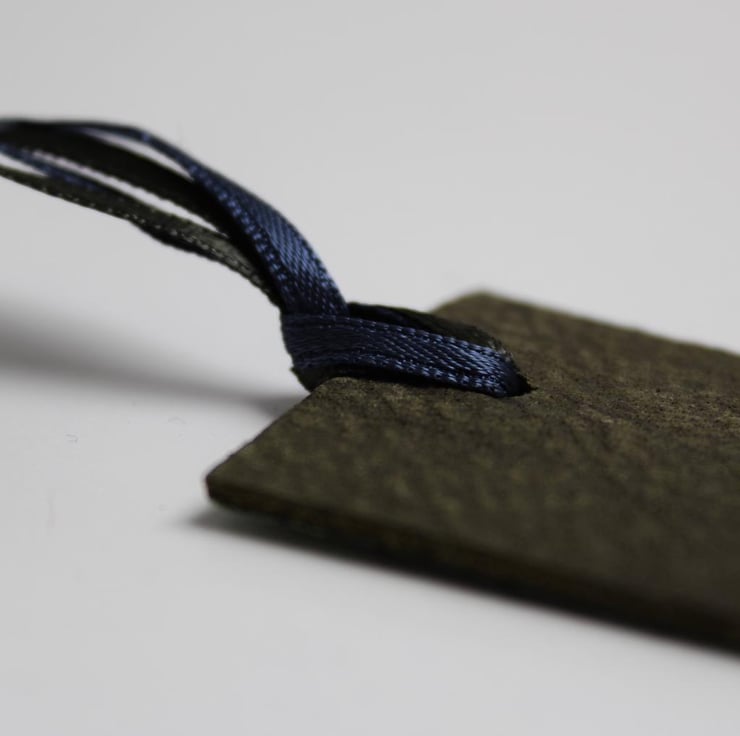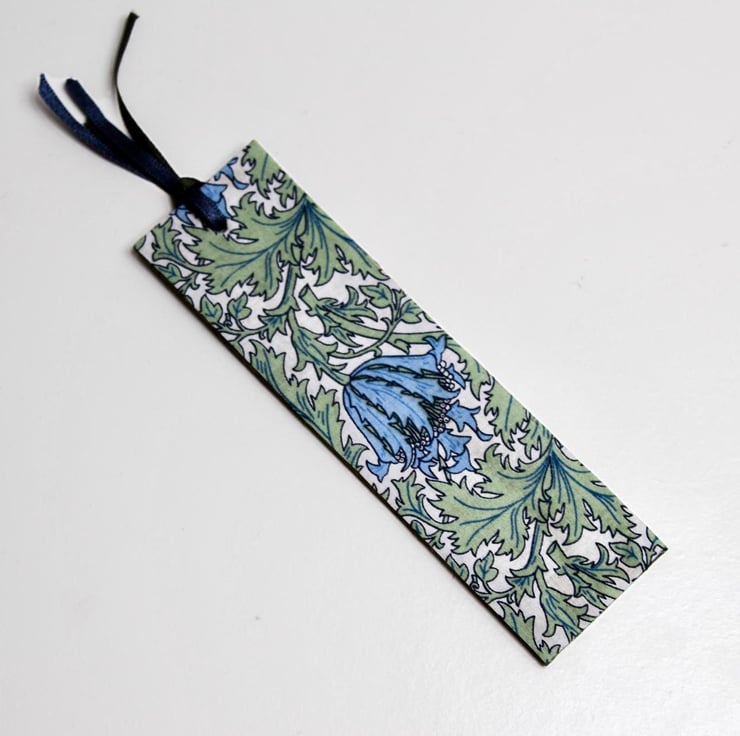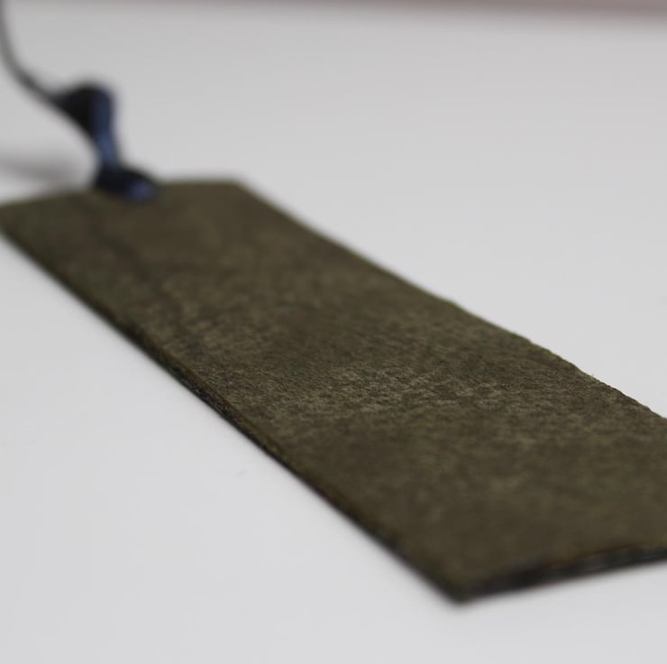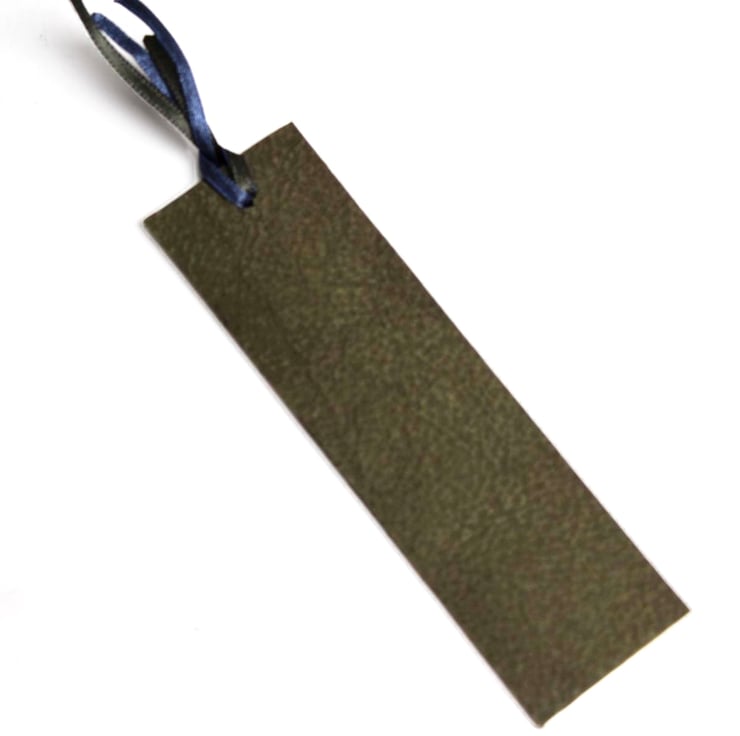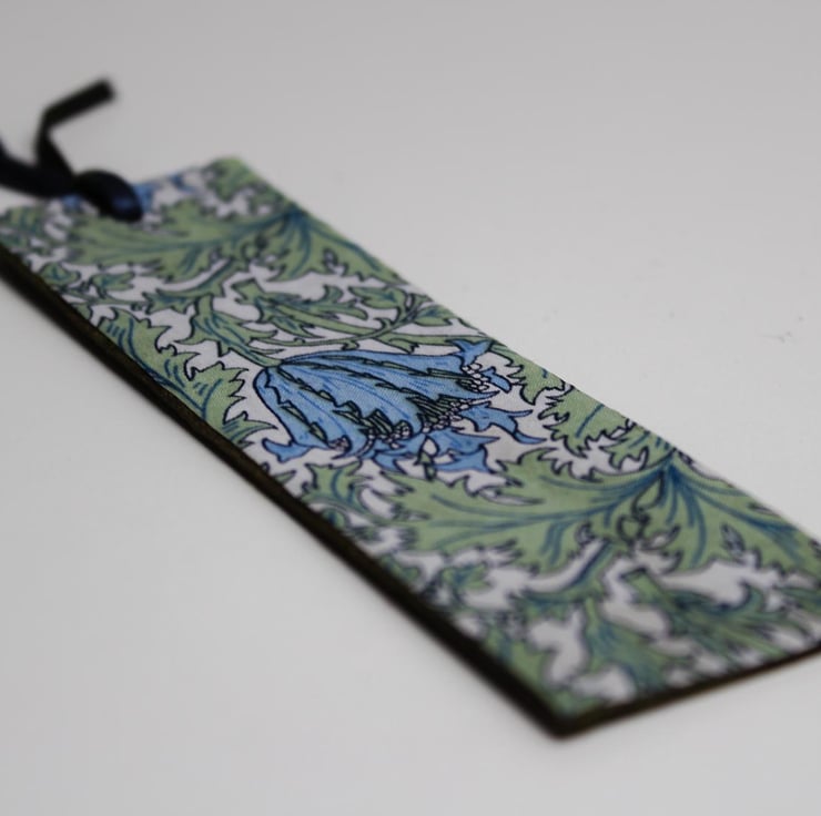 Gorgeous soft to touch green leather handmade bookmark with a green and blue floral lining and blue and green ribbon tail.