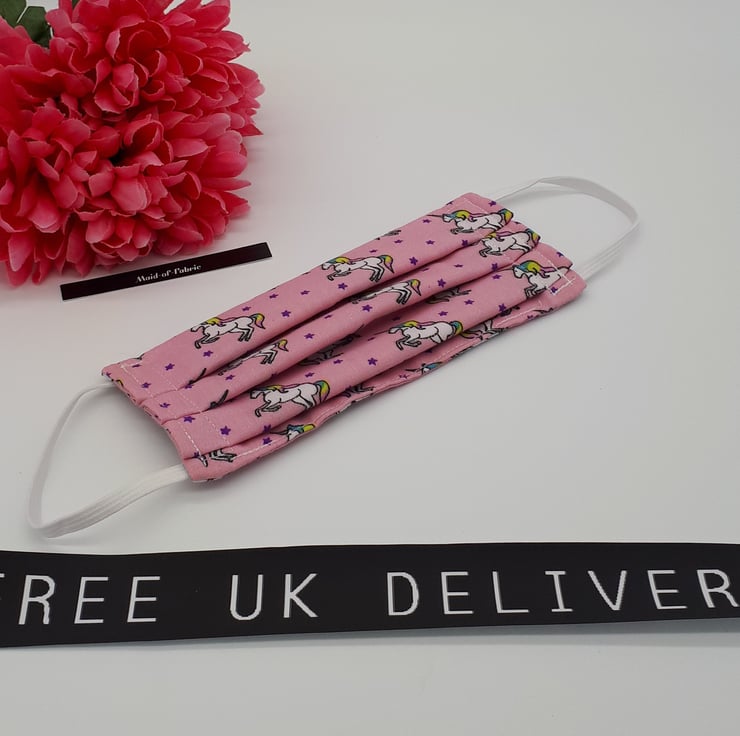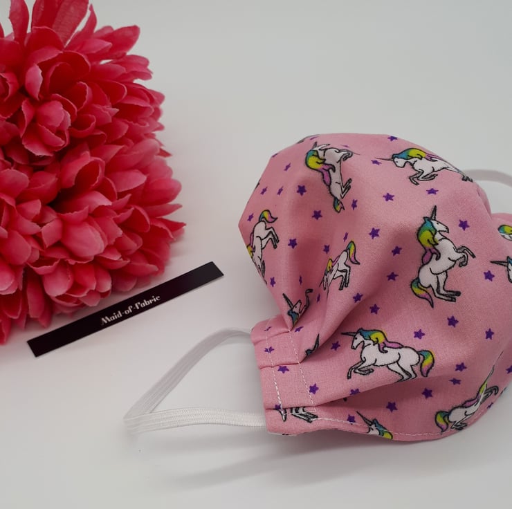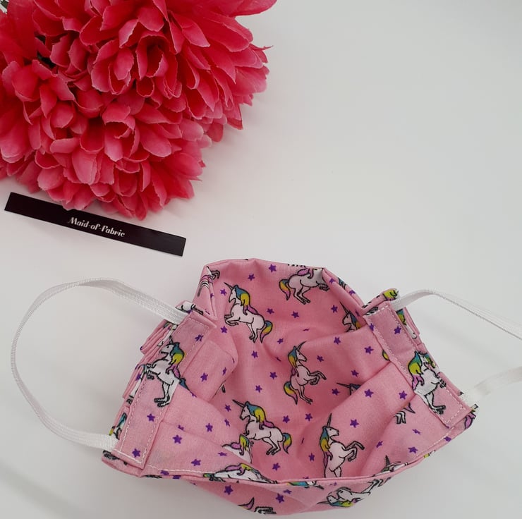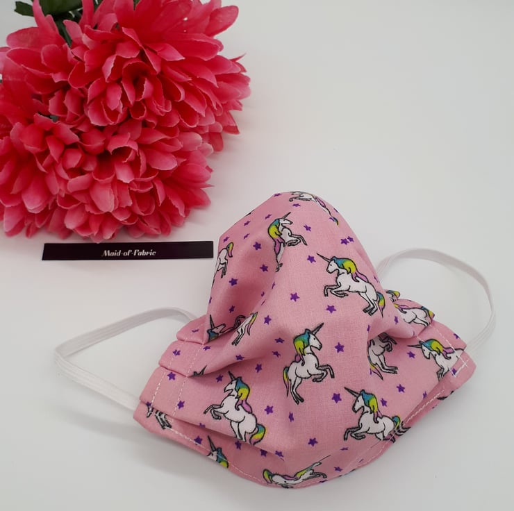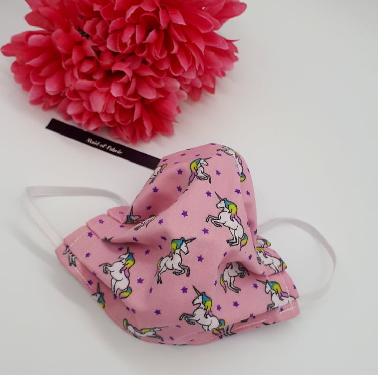 Face mask, small, 3 layer, machine washable in pink unicorn fabric.