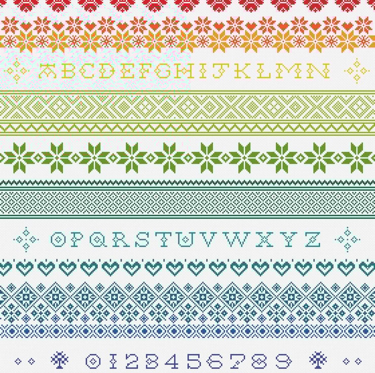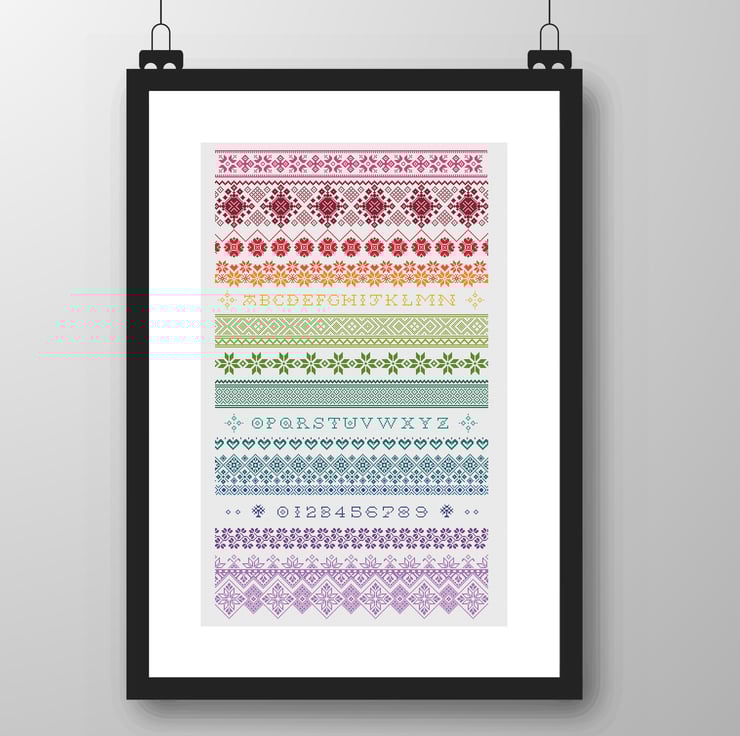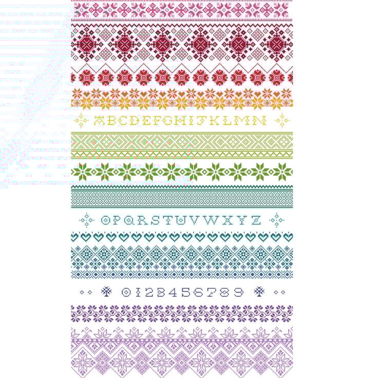 Cross Stitch Pattern - REDUCED HEIGHT Rainbow Band Alphabet Long Dog Sampler on White background - Advanced cross stitch/tapestry chart full length version - for the discerning stitcher by Vivsters. No delivery costs - PDF file straight to your inbox. Start stitching straight today!