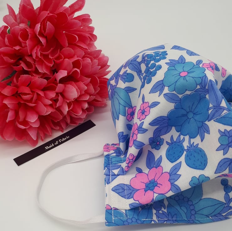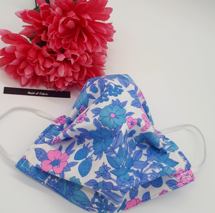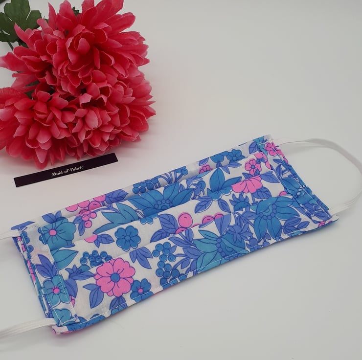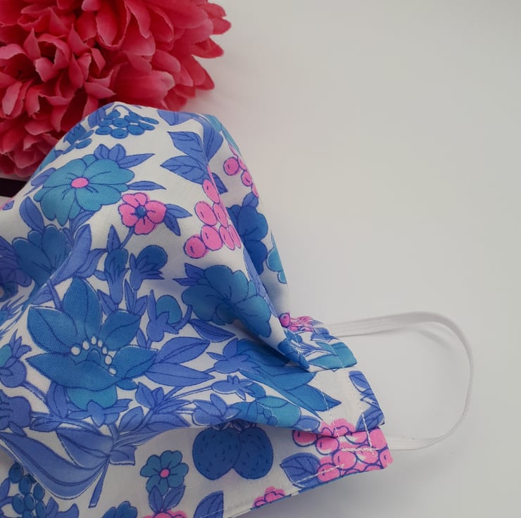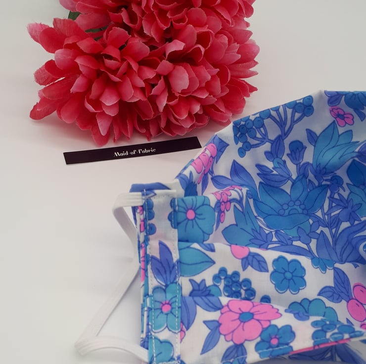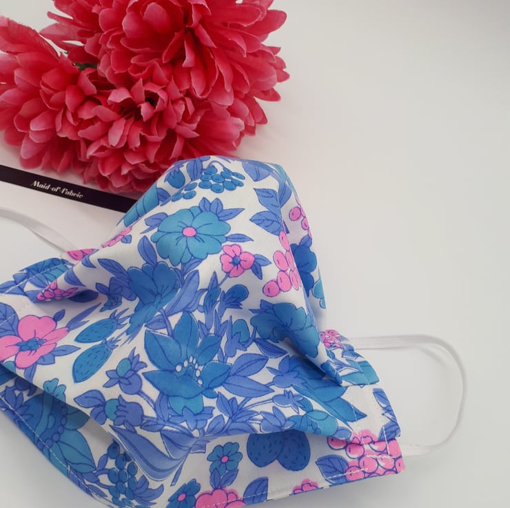Face mask made using a blue, pink and white flower cotton fabric and white elastic.