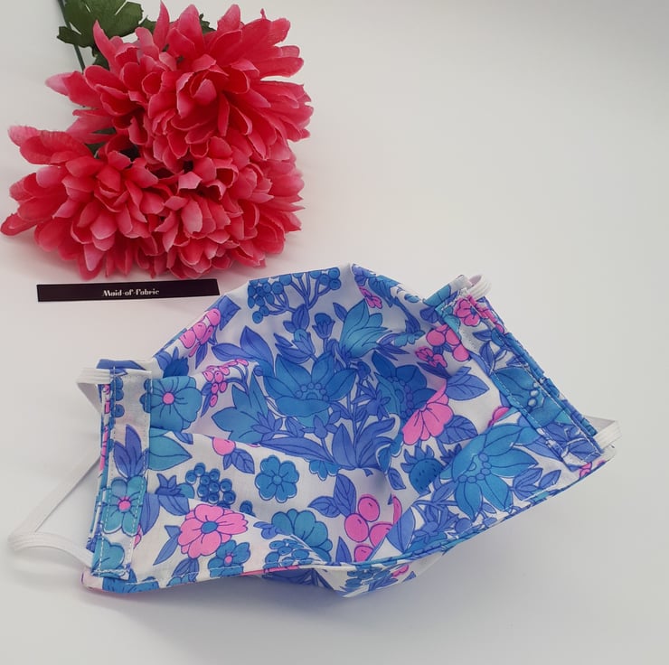 Face mask, large, 3 layer, machine washable in blue and pink flower fabric