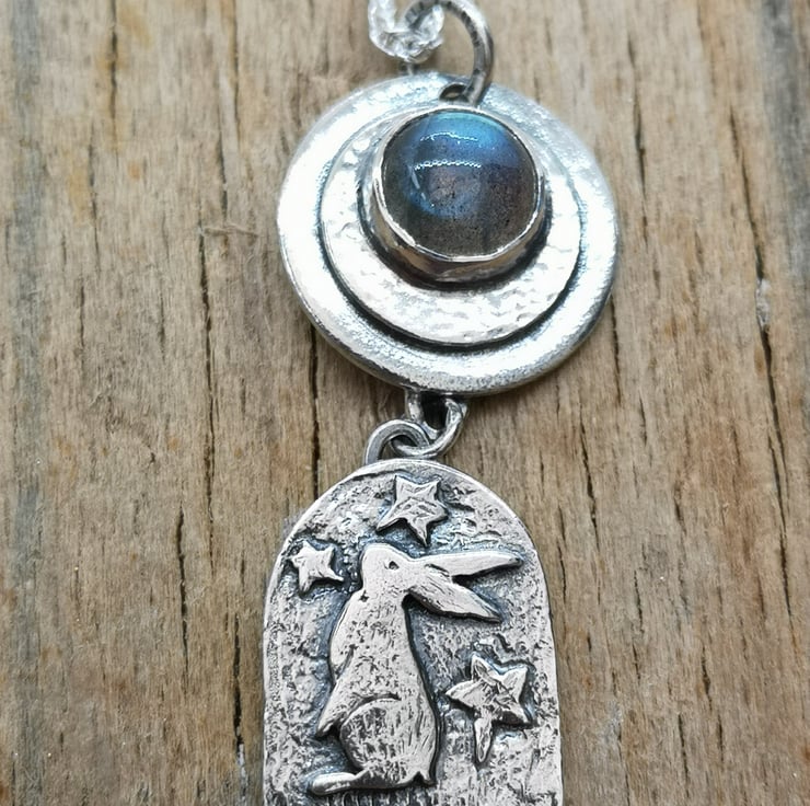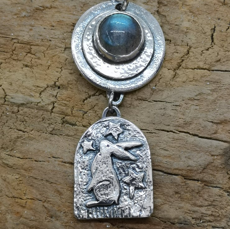 Made using traditional jewellery making techniques, piercing out silver, hand engraving and hammer texturing, this gazing hare pendant is set with a lovely 8mm labradorite and has an oxidised finish.