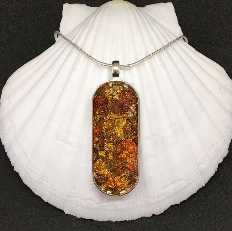 I have created this pendant using a mixture glorious earthy tones with the added shine of gold, copper and russet metallic flakes that I embed into a layer of resin forming this jewelled pendant that reminds me of autumn leaves. I seal the pendant with a topcoat of clear resin for a smooth and glossy finish.