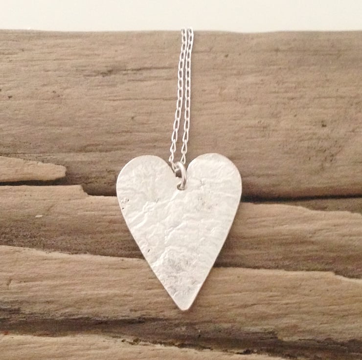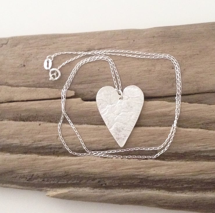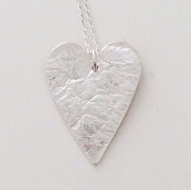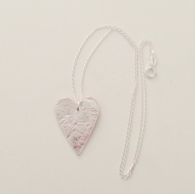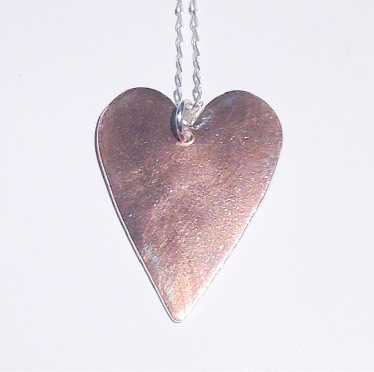 This beautiful hand crafted heart pendant has been hand sawed from sheet copper. It has been given a unique irregular reticulated style layer of sterling silver on the front which gives it an attractive organic, abstract style surface pattern.