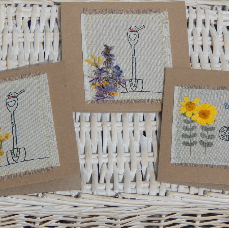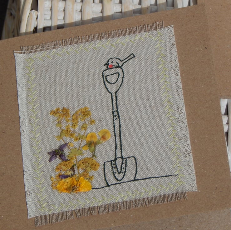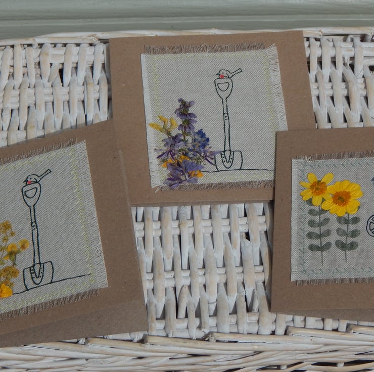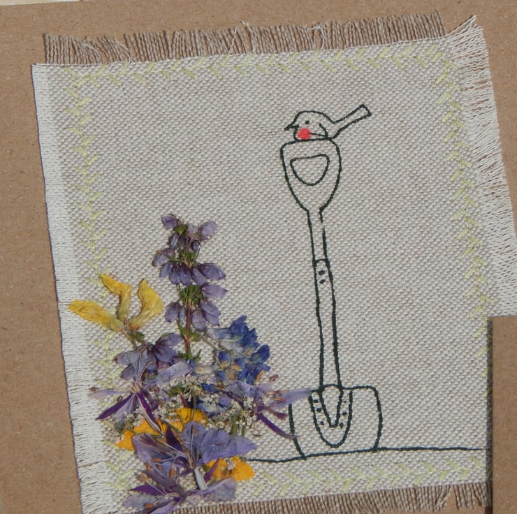 - There are 2 cards with a screen printed robin on a spade with dried flowers.