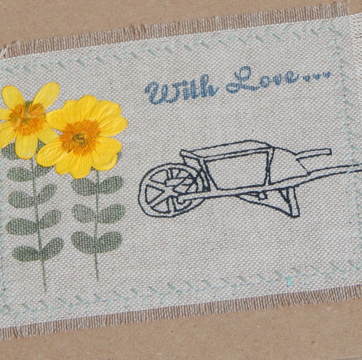 - card with a screen printed wheelbarrow, stamped With Love and plant stem. There are dried buttercups.