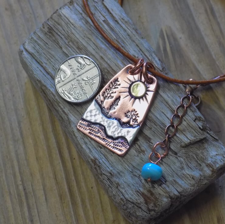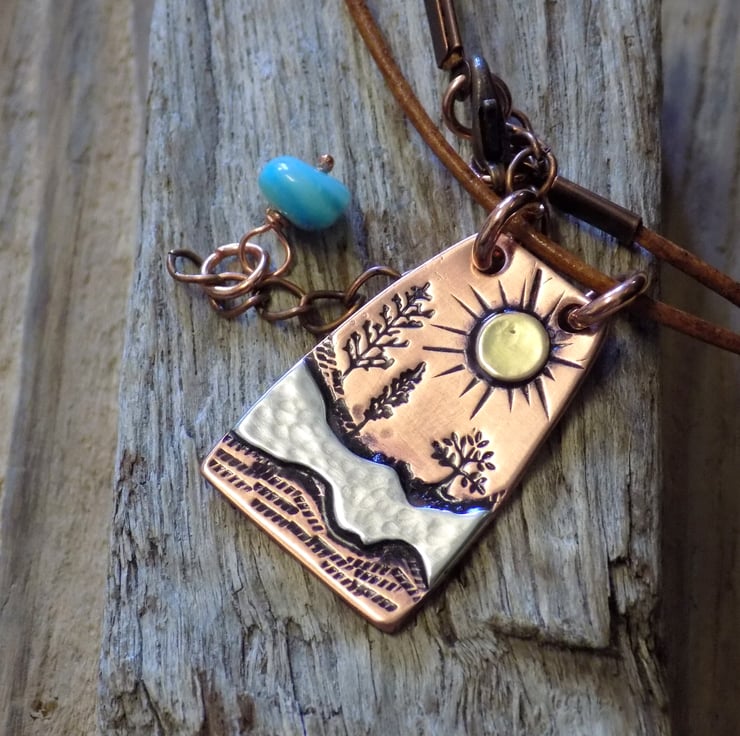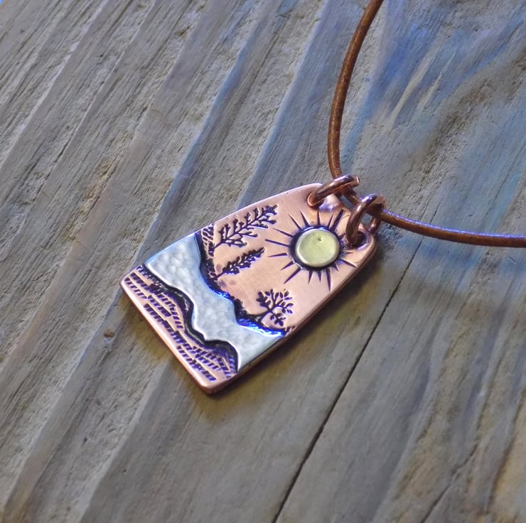 Made from copper and sterling silver sheet. A layer of silver has been carefully soldered to the bottom of the pendant which has a dappled finish to give the effect of a rugged foreground. The middle ground has been given a little texture and some trees, and a shining brass sun has been added to set the seen. Simply hung on an adjustable antique leather finish cord - necklace 16-18"