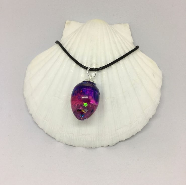 Multicoloured purple and pink small egg pendant with glitter and star inclusions. Made with resin and alcohol inks which blend and flow together creating new colours and tones.