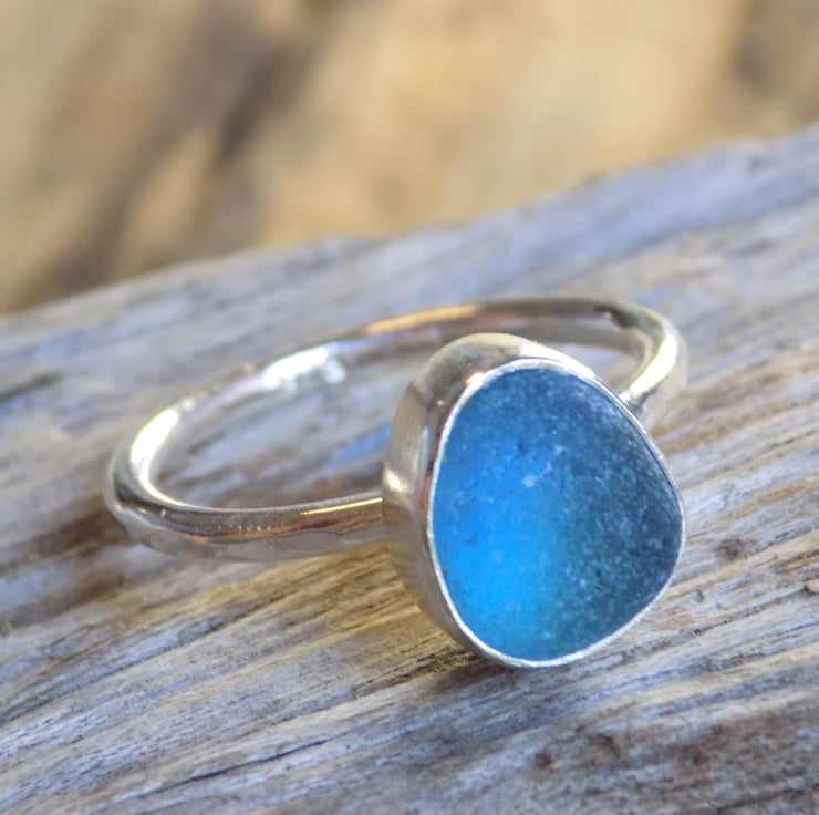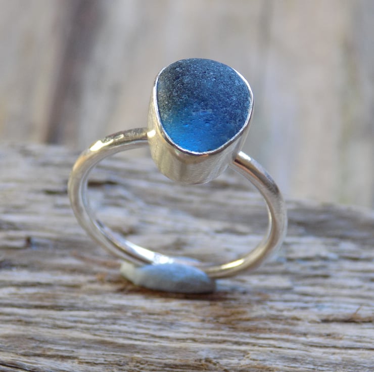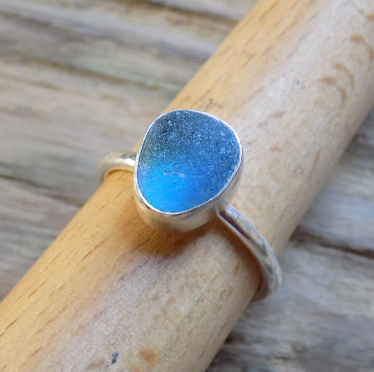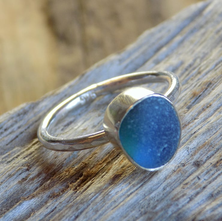 A beautiful green/blue piece of sea glass set in a custom made sterling silver bezel, soldered atop a 1.8 mm thick sterling silver ring shank. Size UK O. Marked with a 925 punch.