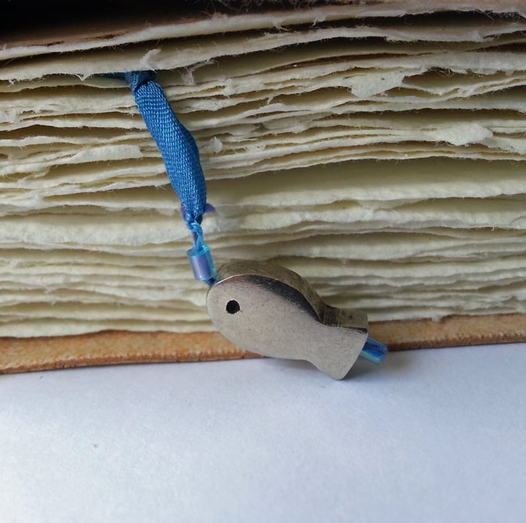 There is a silk ribbon page marker, with a silver metal fish embellishment