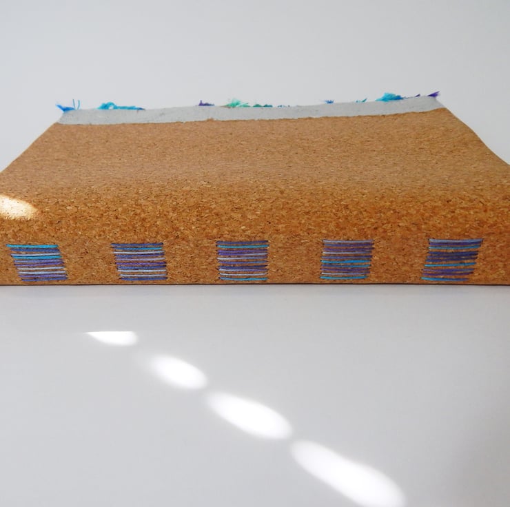 Hand bound with cotton thread in multi-shaded blue and purple, with a modified long stitch.