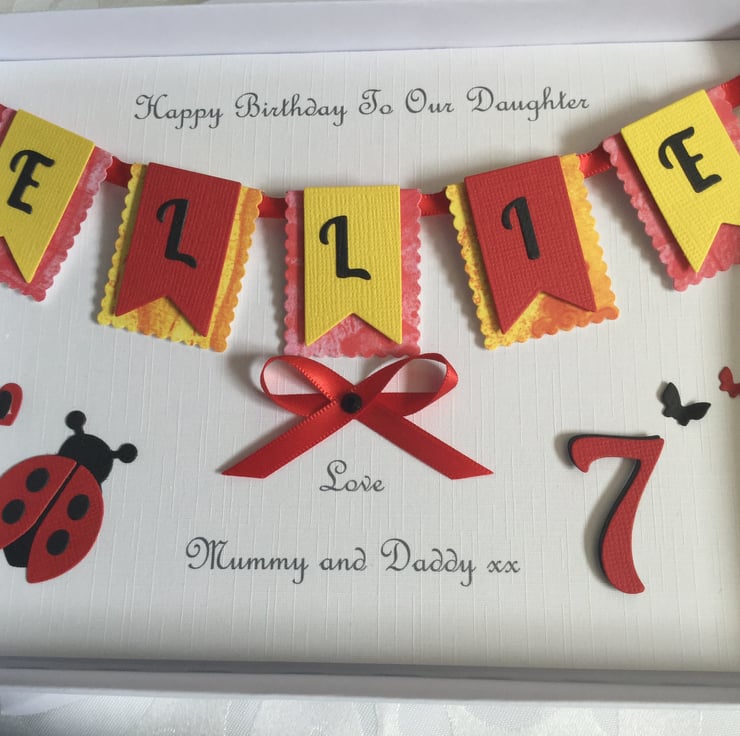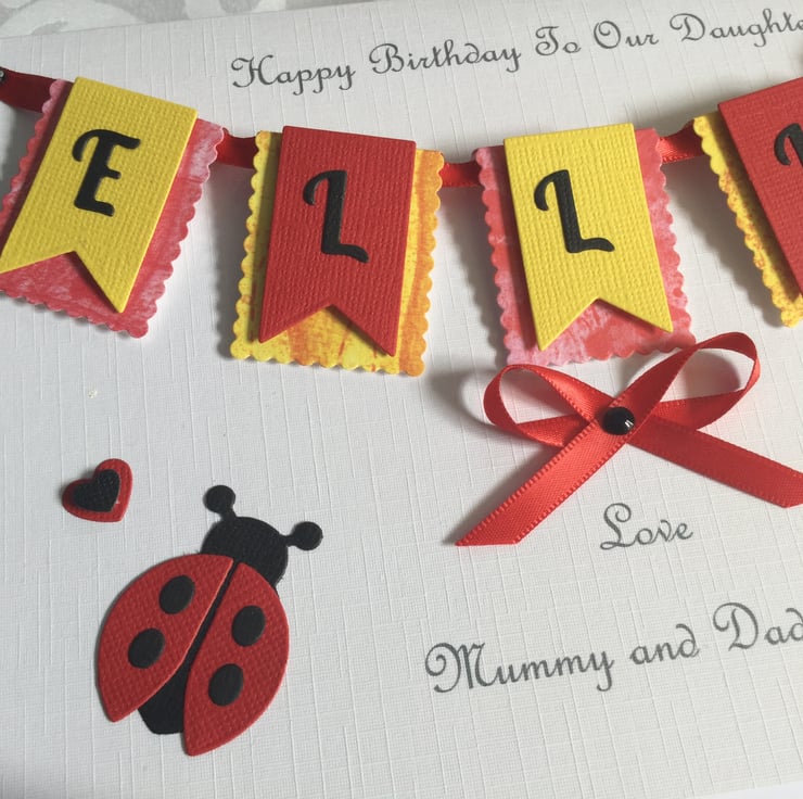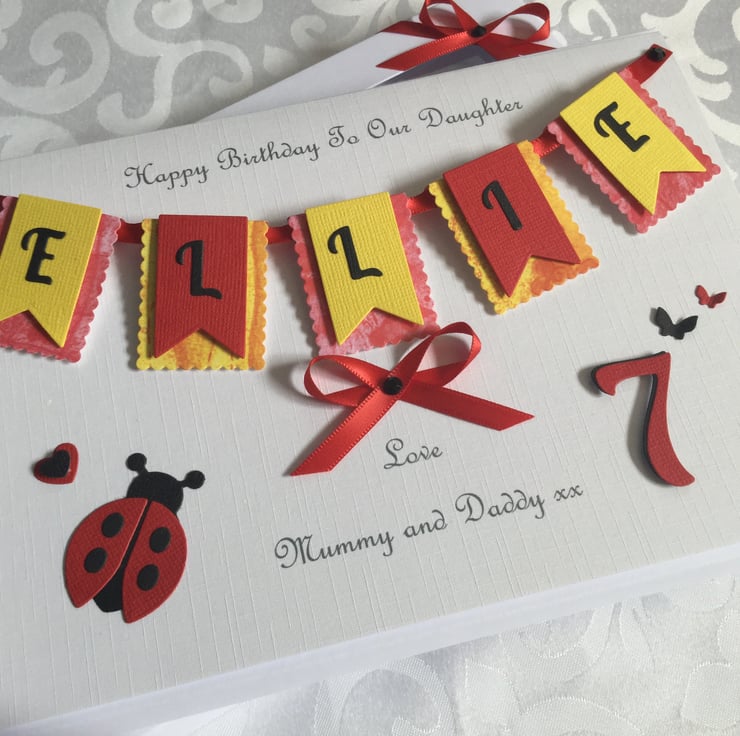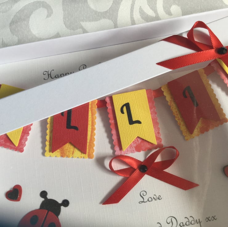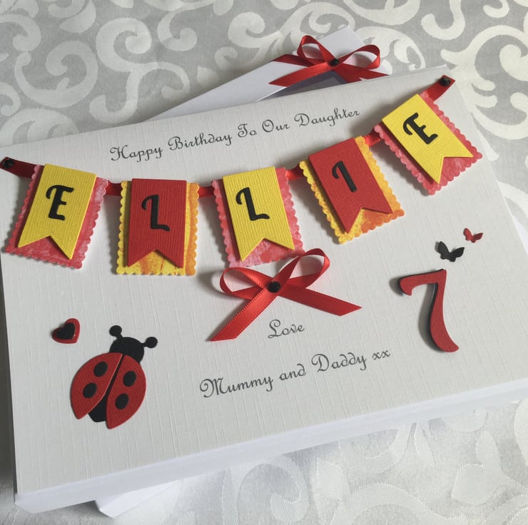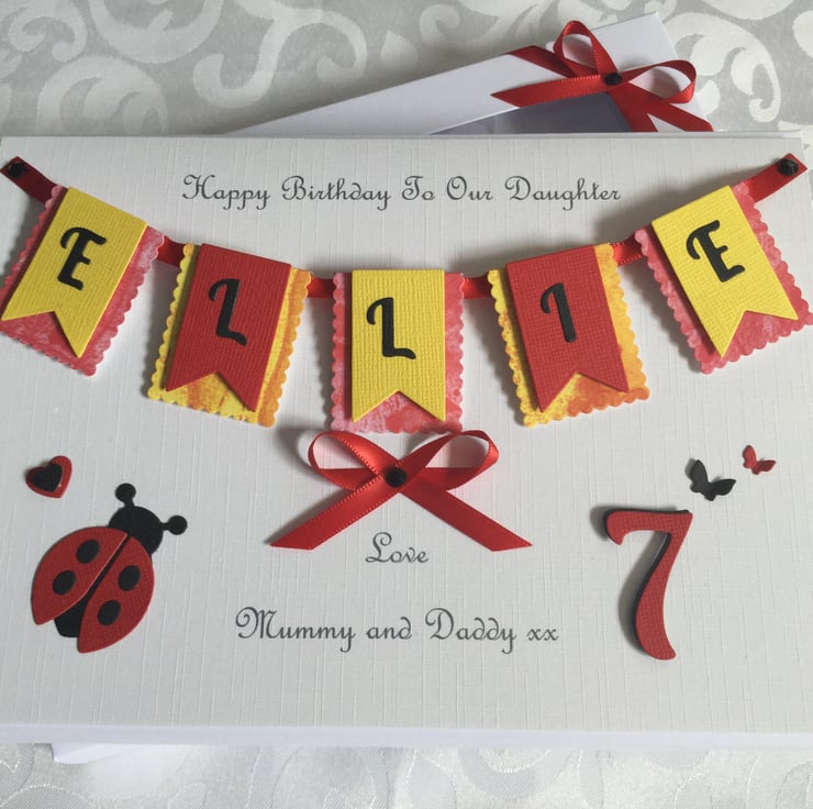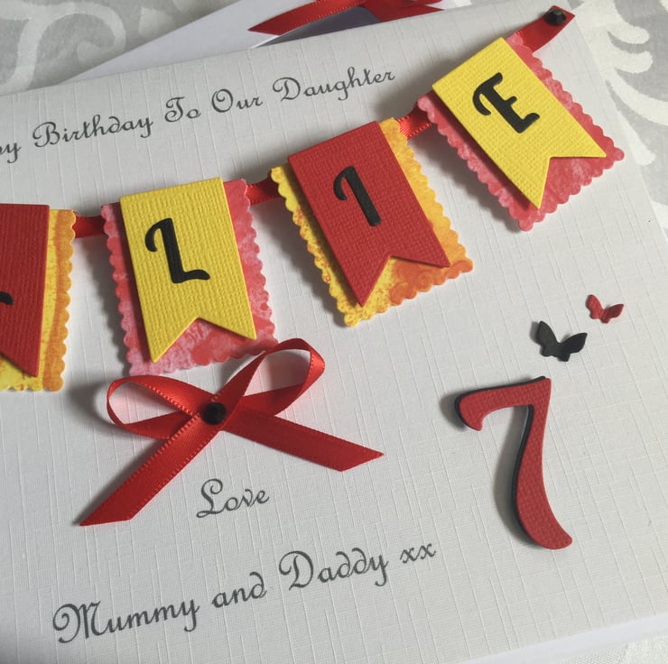 This handmade personalised card is A5 in size ( 210mm x 150mm) and is on 300gsm heavyweight linen cardstock. A name of up to seven letters can be made on the bunting. This card can be for any birthday or special occasion. Any age can be put on the card in large numbers or this can replaced with butterflies.