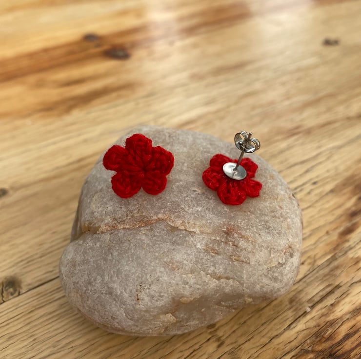 Add a subtle touch of boho to any outfit with these dainty flower studs. I crocheted the flowers in red cotton, then attached them to hypoallergenic surgical steel studs.