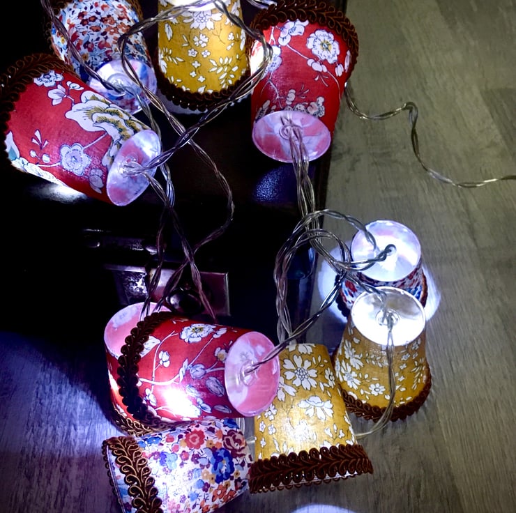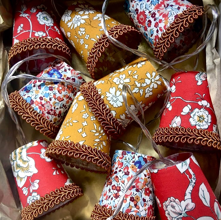 These mini lampshades are perfect to drape along a mantlepiece or shelf, around the head of a bed, or strung across a mirror or picture frame.