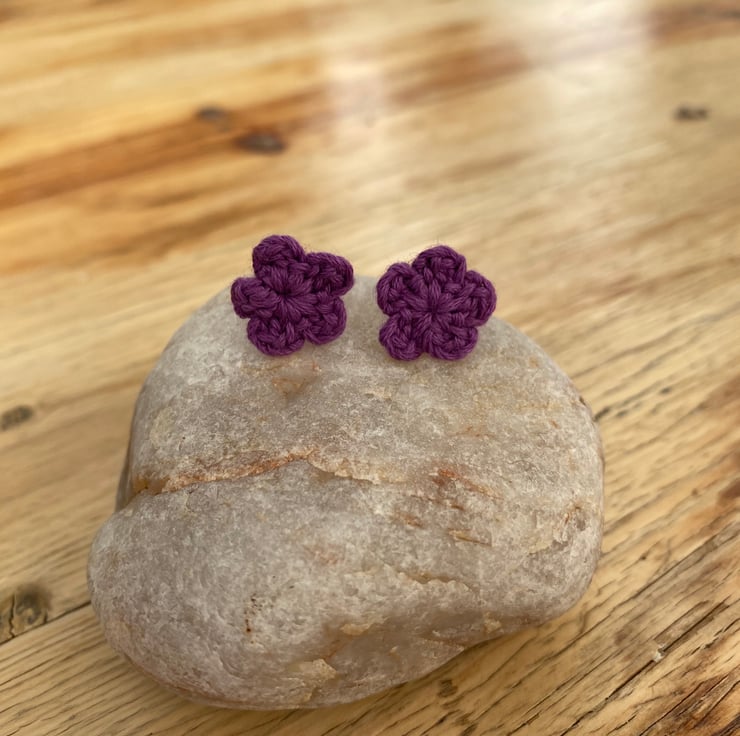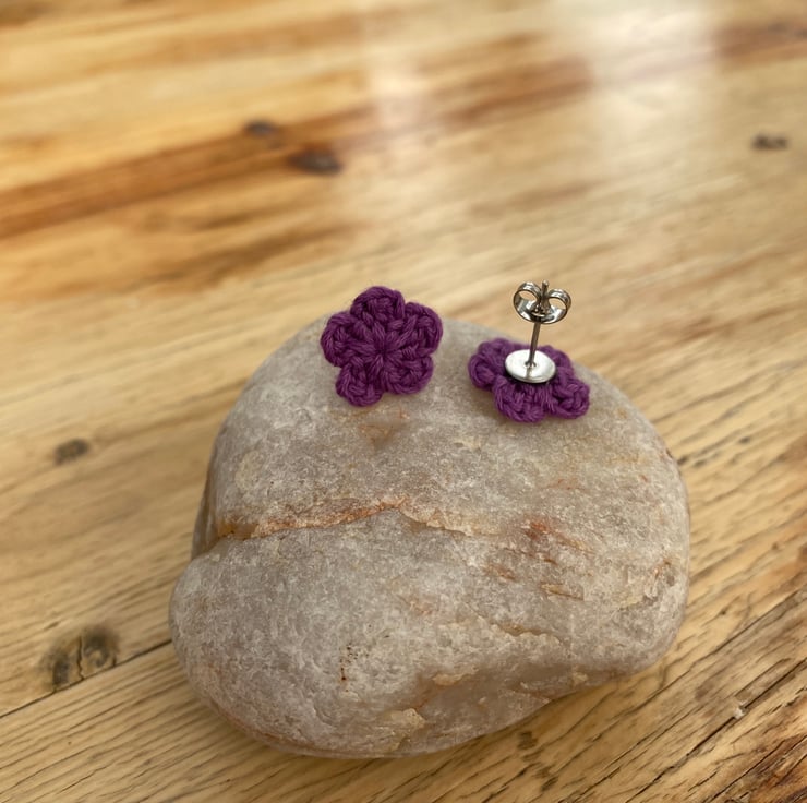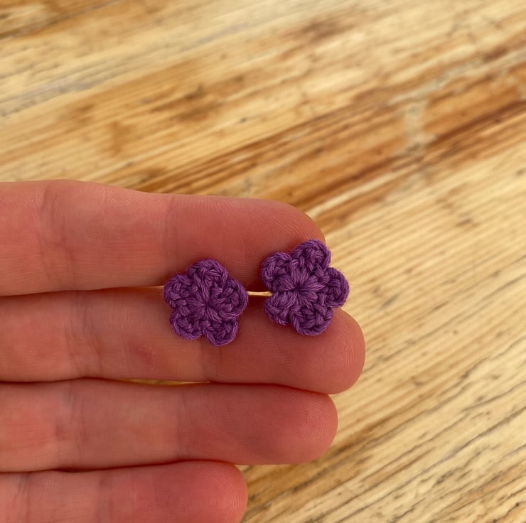 I crocheted the flowers in purple cotton, then attached them to hypoallergenic surgical steel studs.