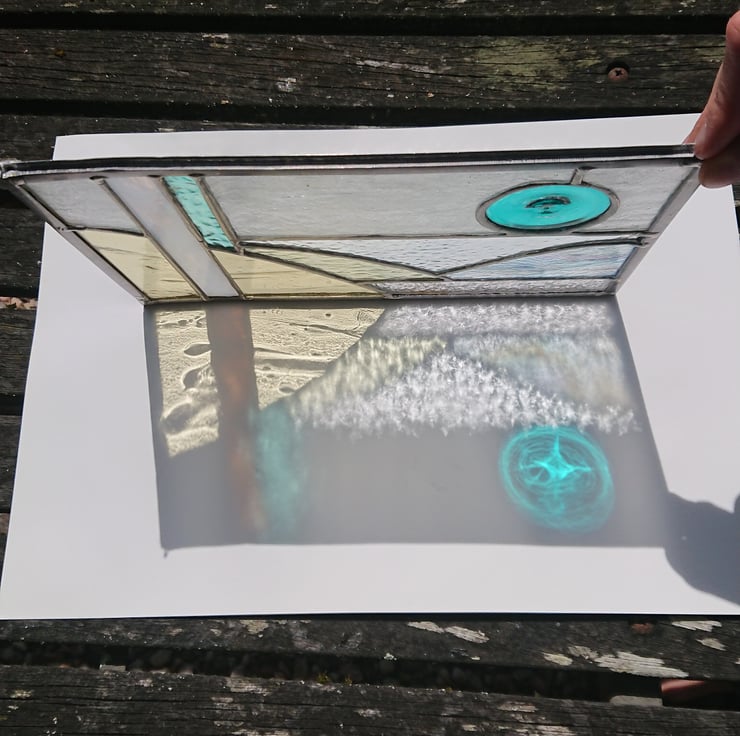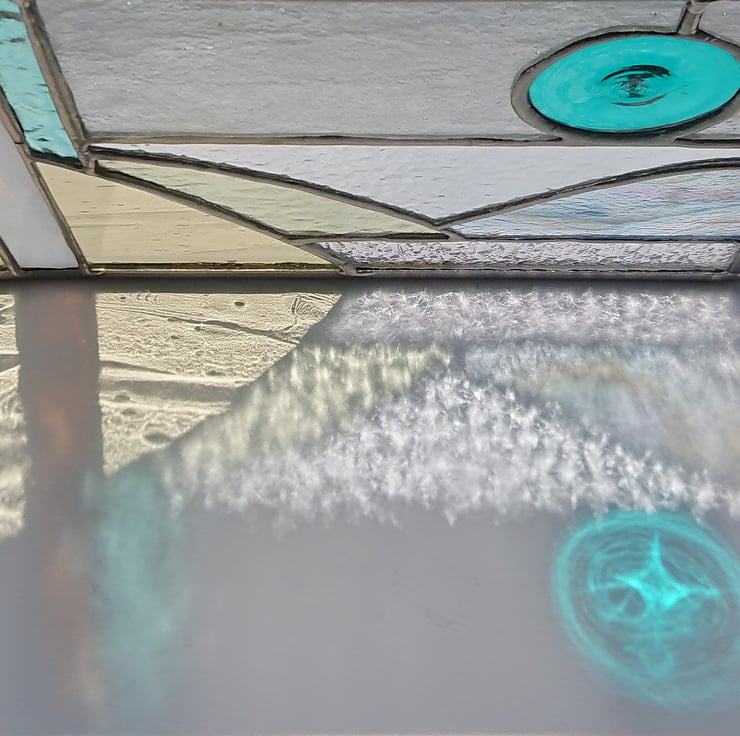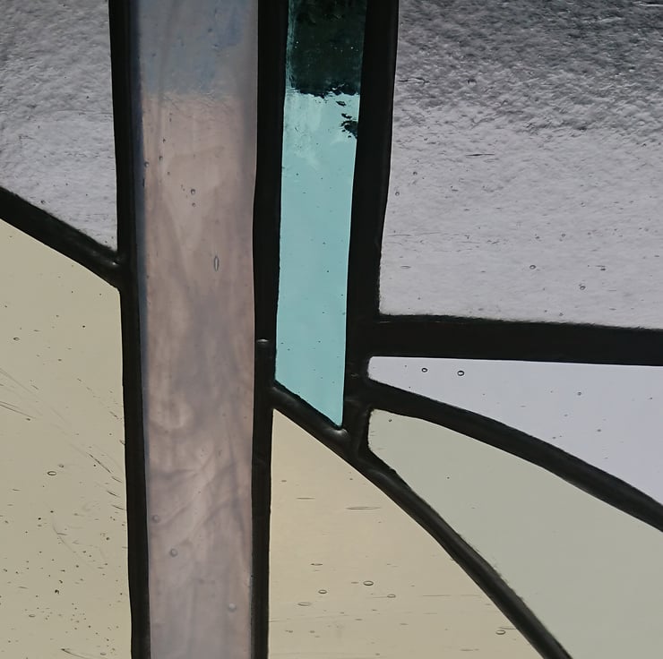 This abstract panel is made with cut glass and copperfoil but I have also framed it with a lead came edge. The addition of the lead surround makes it a very sturdy, strong piece and gives the copperfoil panel a pleasing substantial weight.