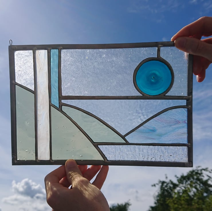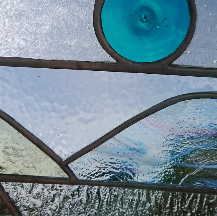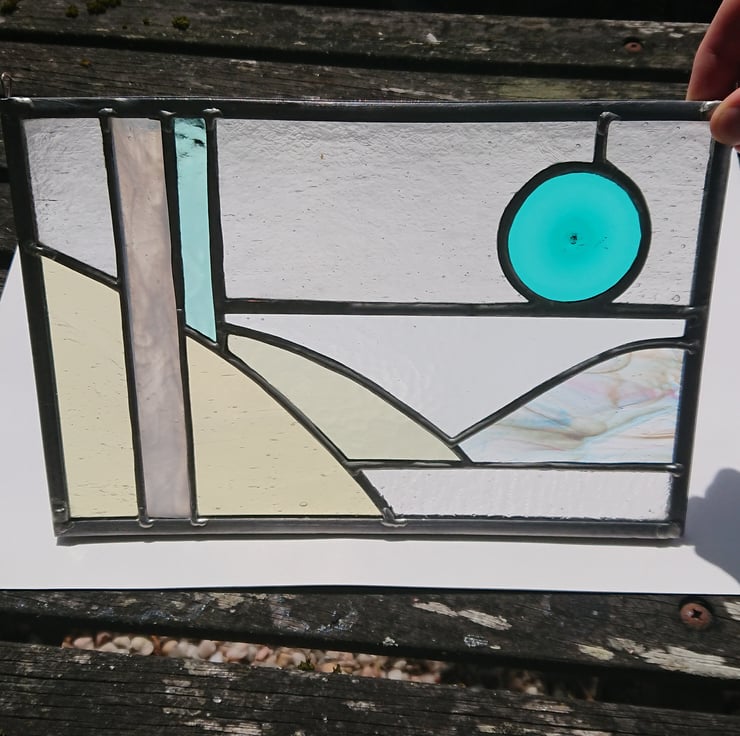The colour palette for this panel is very subdued. It is based on transparent or slightly tinted shades with the exception of the turquoise roundel representing the moon. I have mixed a variety textured glass with hints of amber, turquoise, white and blue. This is a representation of the moon rising over a hillside/sea landscape.