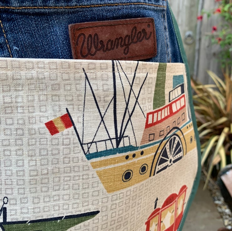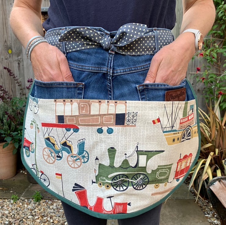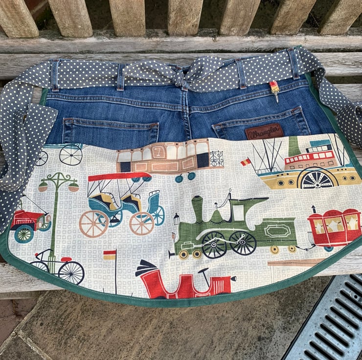 The linen/cotton curtain is decorated with vintage vehicles, trains and boats. The apron features 2 back pockets from the jeans, with 2 more large pockets formed by the cotton fabric. It is edged with bias binding.