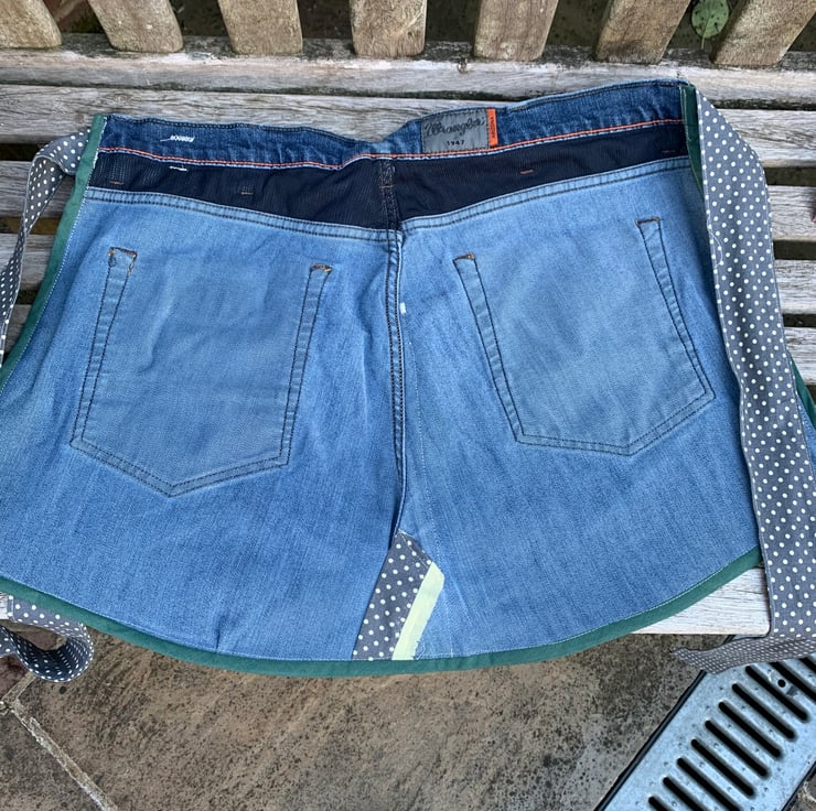 One of a kind garden apron or tool belt made from a recycled jeans and reclaimed vintage curtain fabric.