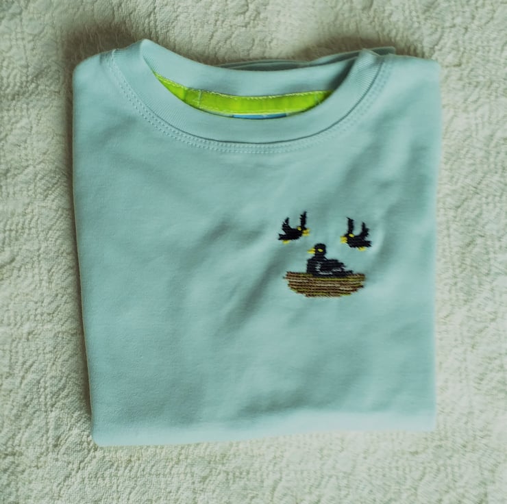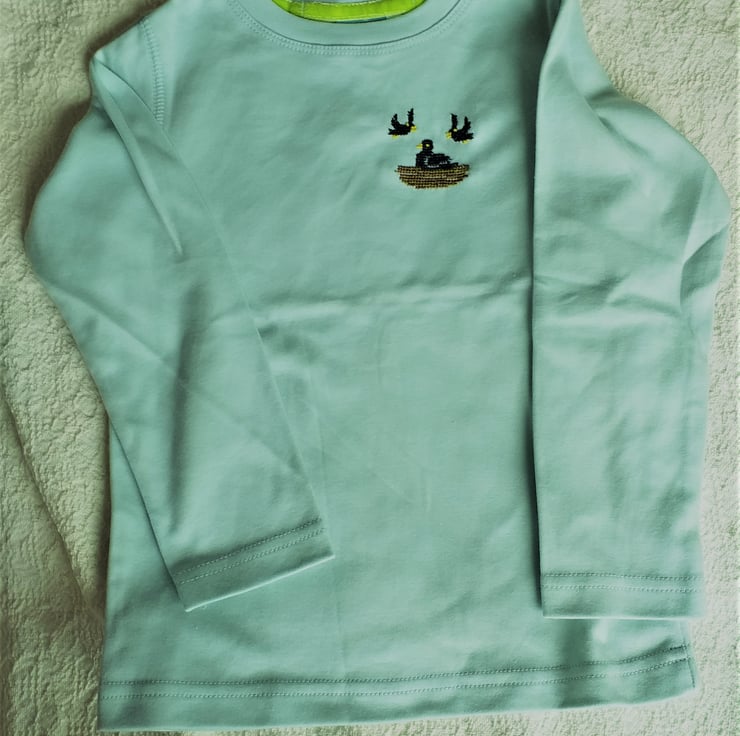 This is a lovely pale green, long sleeved T-shirt, for a 6 year old. On the left front I have hand embroidered a crow sitting on a mossy nest, with two other crows flying behind her, beaks wide. They must be cawing loudly. The shirt has a soft velvet band inside the back of the neck. It is 100% cotton and machine washable. Although the label says 'boy', I think the shirt is equally suitable for a girl.
