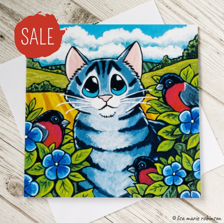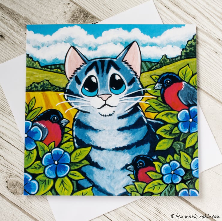 "Bullfinch Bush" - Cute cat art card featuring a grey tabby cat sitting in a bush full of bullfinches.