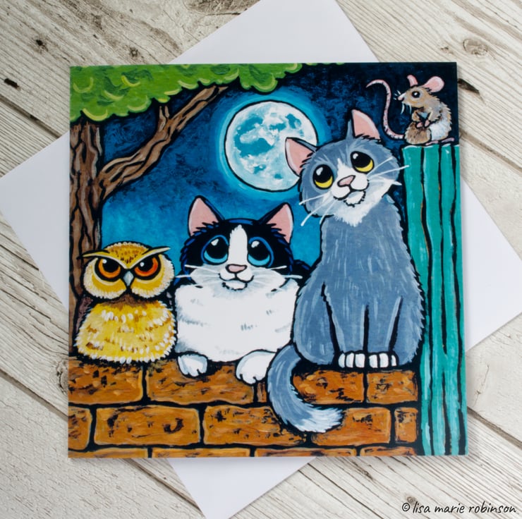 "Unlikely Pals" - Design features a painting of a 2 cats, an owl, and a mouse sitting on a wall under a full moon.